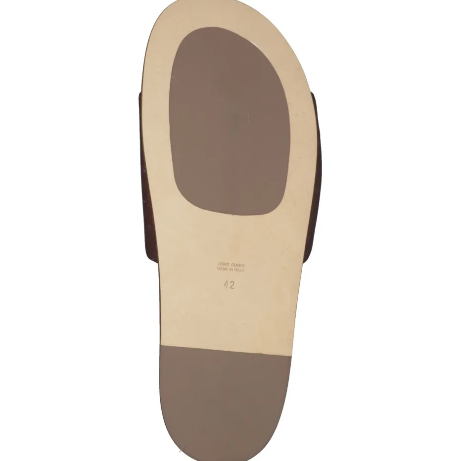 Sommerstil mit italienischer Raffinesse.Konstantin Starke präsentiert mit dieser Pantolette ein Herrenmodell, das reduzierte Eleganz mit hochwertigem Komfort verbindet. Ideal für entspannte Freizeitmomente und warme Sommertage: Das dunkelbraune Lammleder ist fein gearbeitet und zeigt sich in glänzender Optik mit Ton-in-Ton-Nähten. Die klassische Form mit breitem, leicht gepolstertem Riemen und offenem Zehenbereich sorgt für luftigen Tragekomfort. Innen überzeugt ein ergonomisch geformtes, lederbezogenes Fußbett, ergänzt durch eine halb aus Leder, halb aus Gummi gefertigte Laufsohle mit Vero-Cuoio-Prägung – ein Hinweis auf langlebige Herstellung in Italien. Zeitgeistiger Minimalismus trifft auf das Trendthema „Quiet Luxury“. Ein souveräner Begleiter für moderne Looks von Leinenhose bis Polohemd.