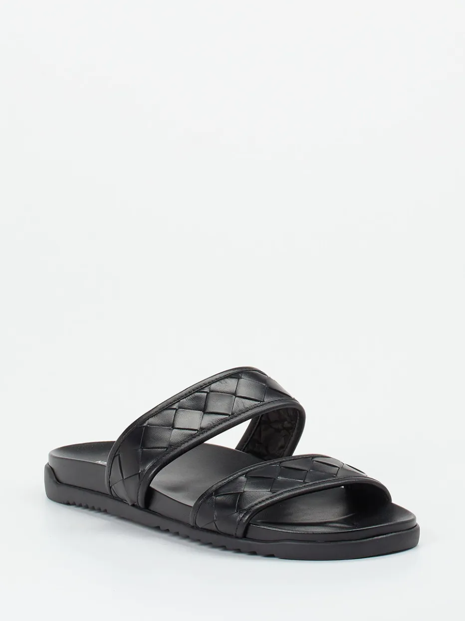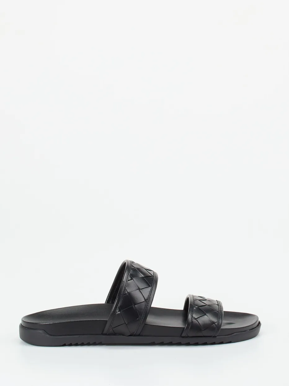 Die flachen Sandalen aus hochwertigem Flechtleder in tiefem Schwarz greifen mit ihrer matten Textur und der symmetrischen Zwei-Riemen-Silhouette aktuelle Minimalismus- und Quiet-Luxury-Trends auf. Das anatomisch geformte Tieffußbett mit Lederbezug sowie die griffig profilierte Gummisohle ergänzen den modischen Anspruch um komfortable Alltagstauglichkeit. Optimal kombinierbar mit luftigen Leinenshorts oder monochromen Streetwear-Outfits.