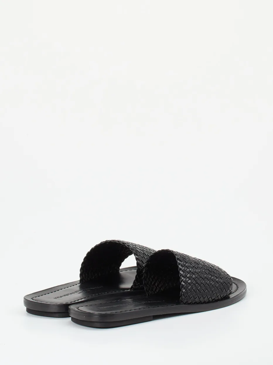 Diese Slides aus schwarzem Flechtleder überzeugen mit minimalistischer Form und hochwertiger Verarbeitung. Ihr handwerklicher Look passt zum Trend ‚Quiet Luxury‘.