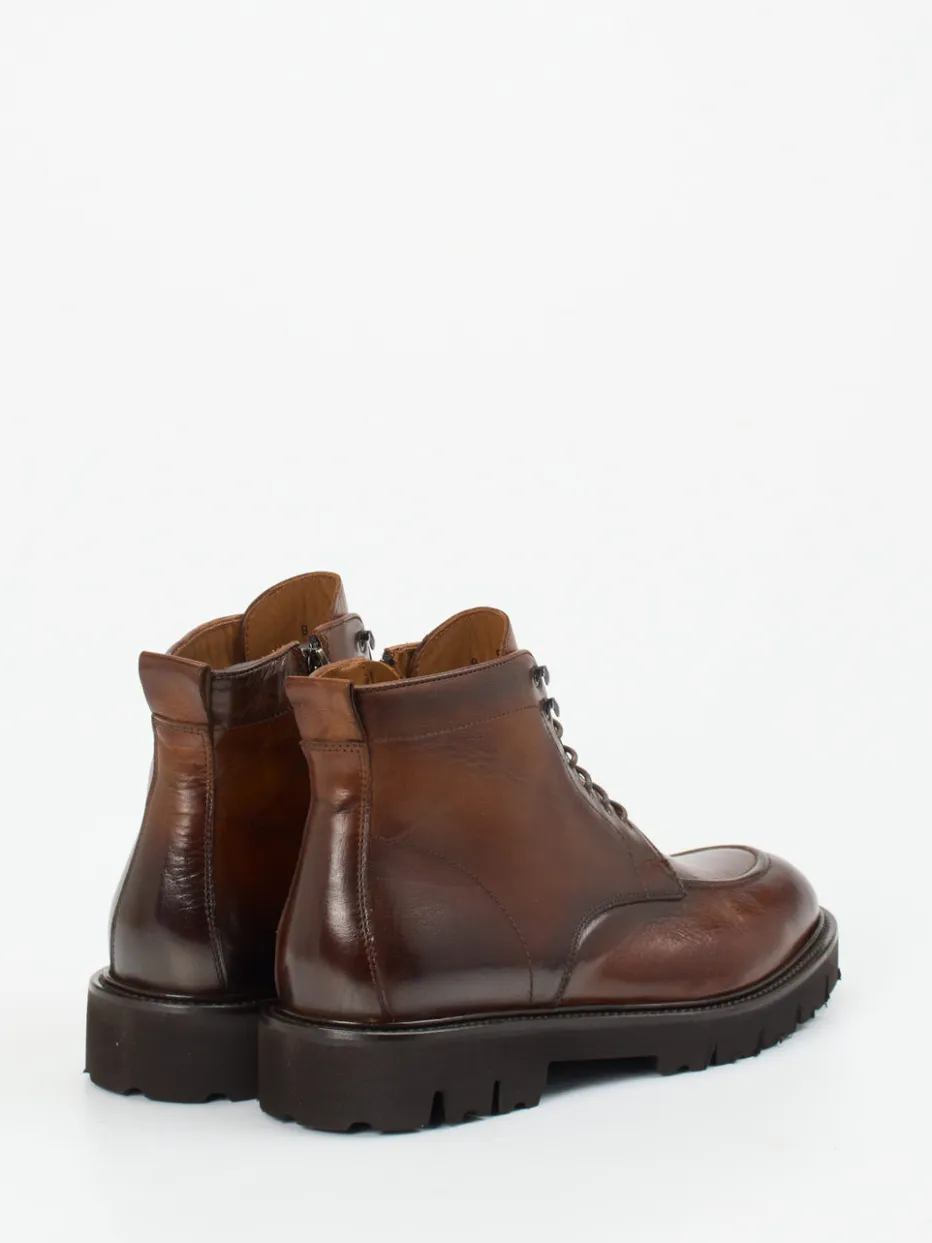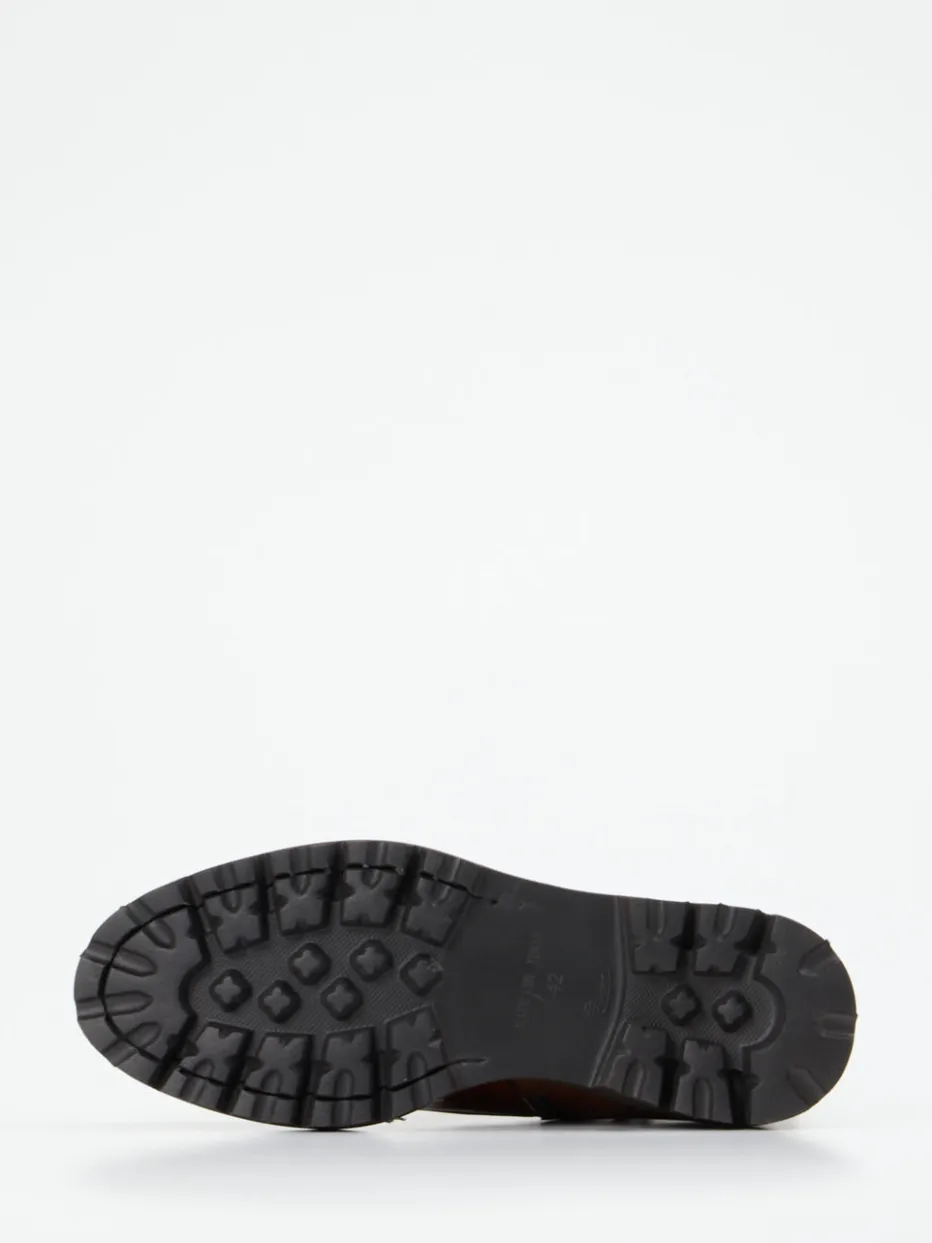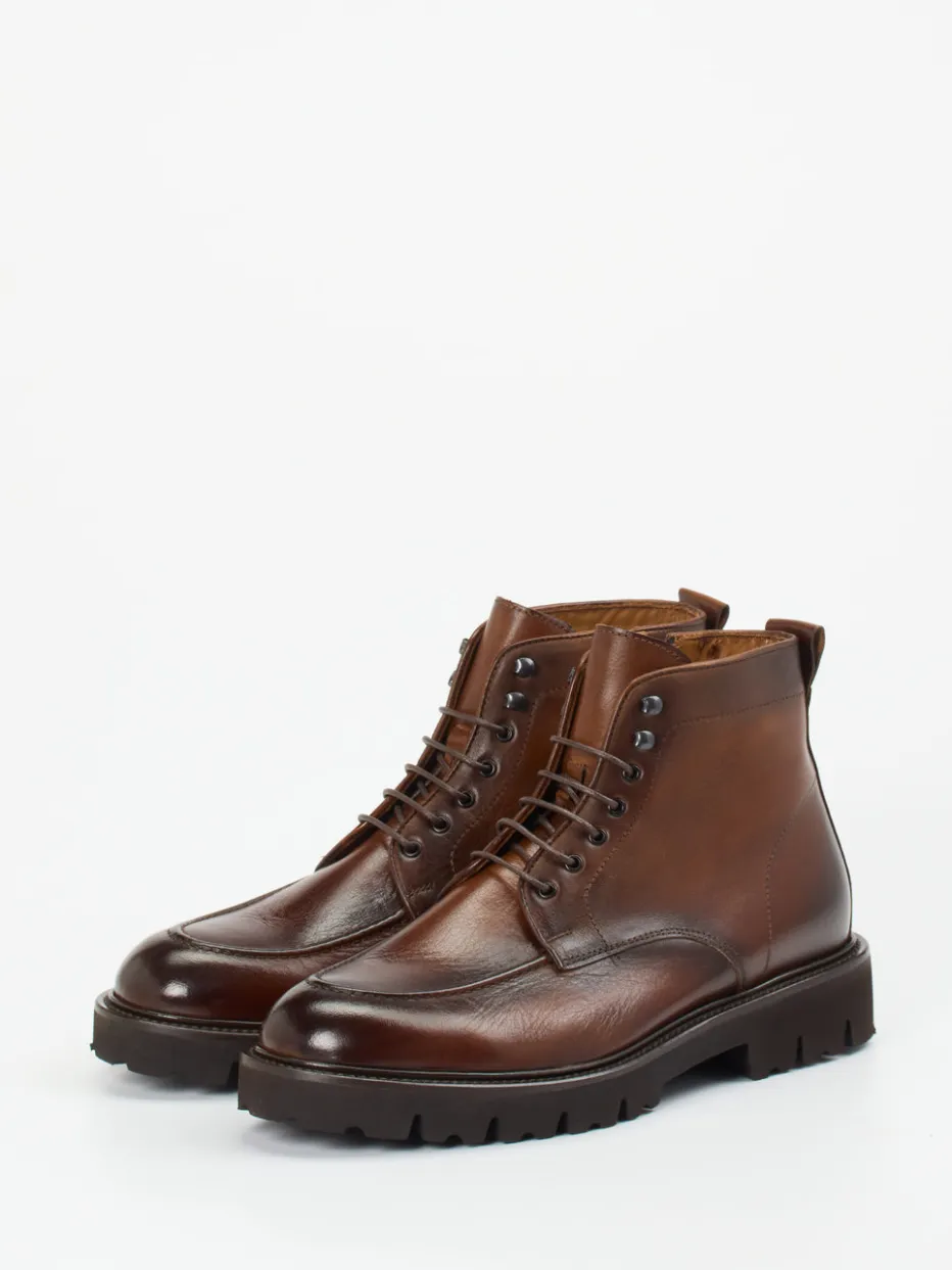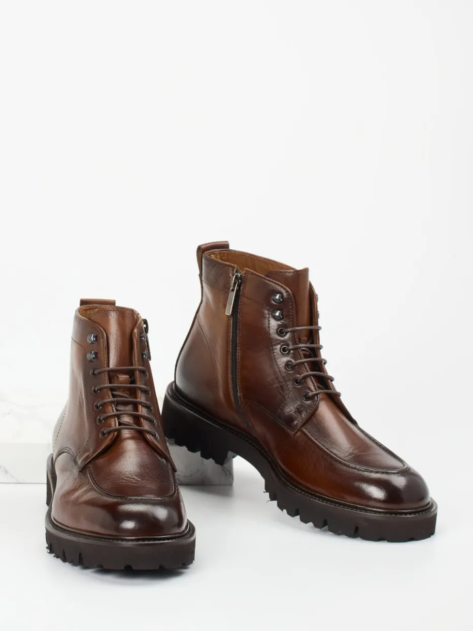Robustes Büffelleder mit edlem Glanz trifft auf funktionale Details wie Reißverschluss und Profilsohle – ein durchdachter Begleiter für kalte Tage mit klarer Formsprache.