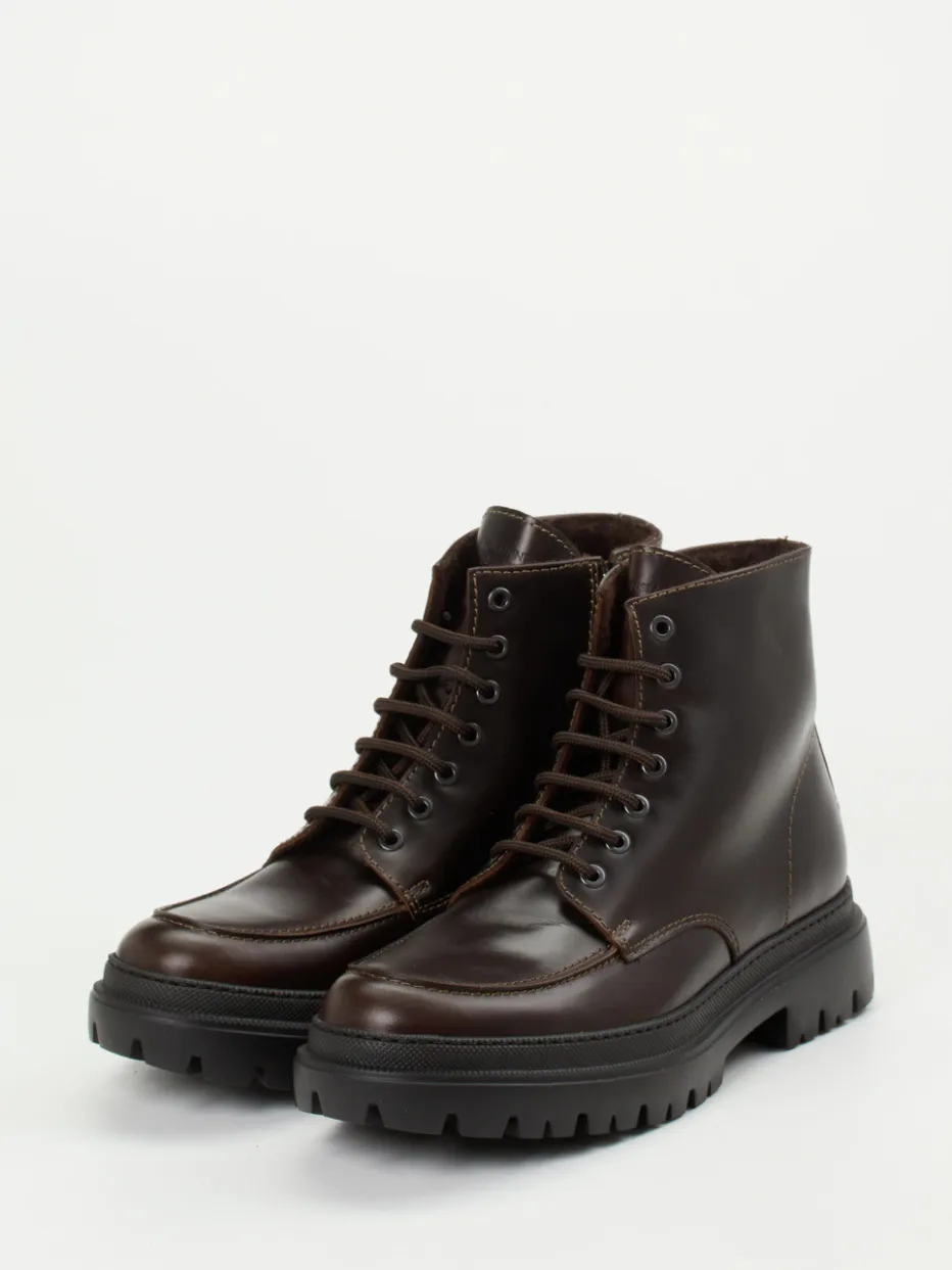 Robuste Eleganz für Herbsttage.Die Marke Konstantin Starke setzt bei diesen Herren-Schnürboots auf eine gelungene Mischung aus Workwear-Ästhetik und modernem Minimalismus. Für anspruchsvolle Alltagsabenteuer geeignet, kombiniert der Boot hochwertiges, maronenbraunes Fettleder mit glänzender Oberfläche und hellbraunen Kontrastnähten. Der knöchelhohe Schnitt, die markante Profilsohle und die Kombination aus Schnürung und Reißverschluss sorgen für Komfort und Stabilität. Innen schützt ein warmes Wollfutter vor Kälte, während die metallverstärkten Ösen und die tief profilierte Gummisohle funktionale Akzente setzen. Ideal zu Casual-Wollmantel und dunklem Ledergürtel. Ein Schuh mit kernigem Charakter und hohem Tragekomfort – kompromisslos stilbewusst.