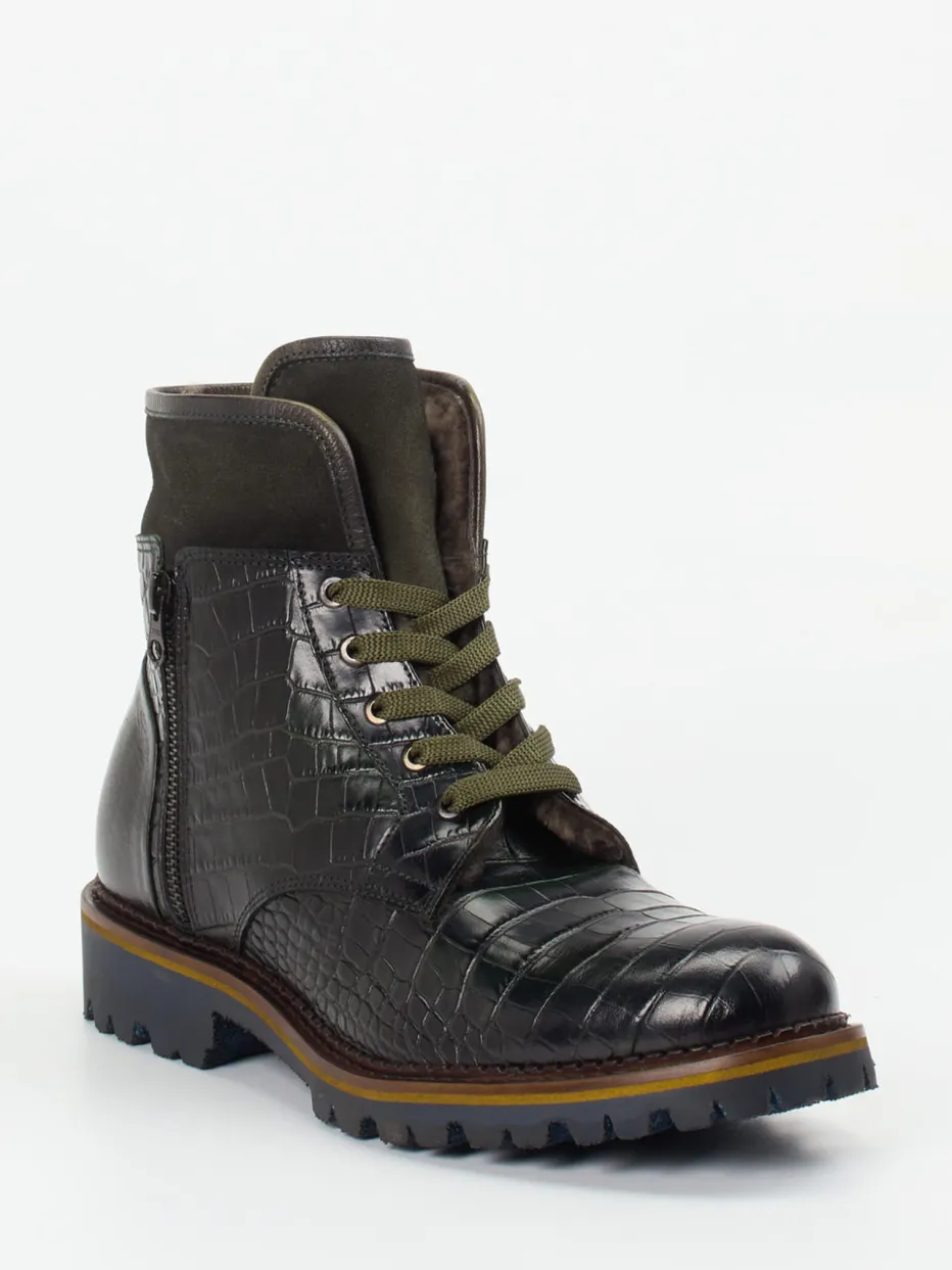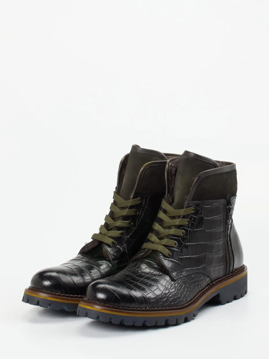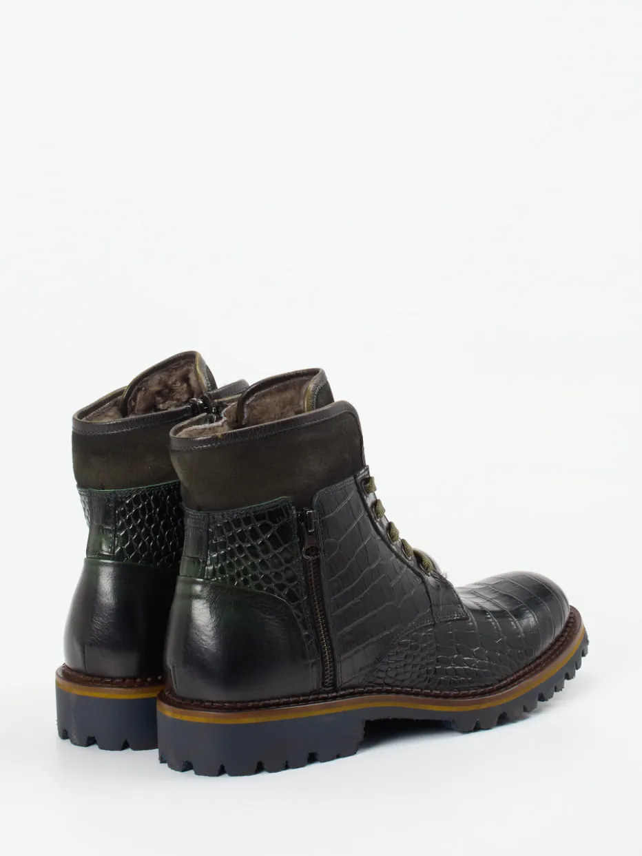 Die Kombination aus glänzendem Krokoleder, Veloursdetails und Lammfellfütterung verleiht diesem Modell Charakter und funktionalen Komfort im urbanen Wintereinsatz.