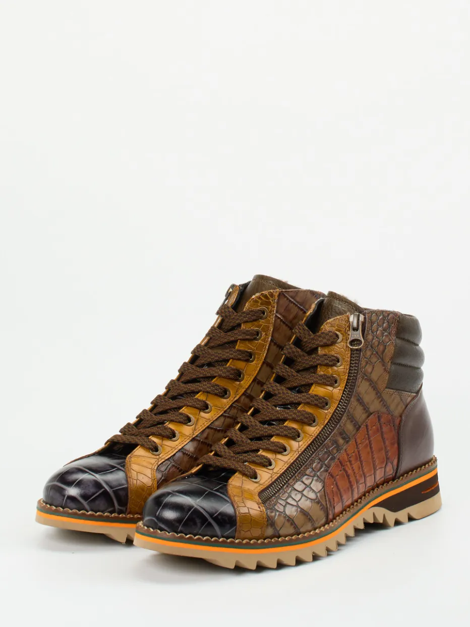 Statement trifft Komfort.Konstantin Starke interpretiert Herren-Schnürboots in markanter Streetwear-Ästhetik. Ideal für kühle Tage im urbanen Alltag: Glänzend geprägtes Leder in Kroko-Optik unterstreicht die Silhouette in warmem Braun, ergänzt durch rost- und dunkelbraune Akzente. Der seitliche Reißverschluss erleichtert das Anziehen, während schnürbare Textilösen den Sitz präzisieren. Innen schützt wärmendes Lammfellfutter, außen setzt die zweifarbige Gummisohle mit Haifischprofil ein selbstbewusstes Finish. Stilistisch inspiriert von Retro-Sneakern mit Streetstyle-Flair. Stilvoller Hybrid mit modischer Raffinesse und funktionaler Ausstattung.