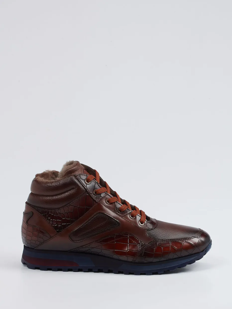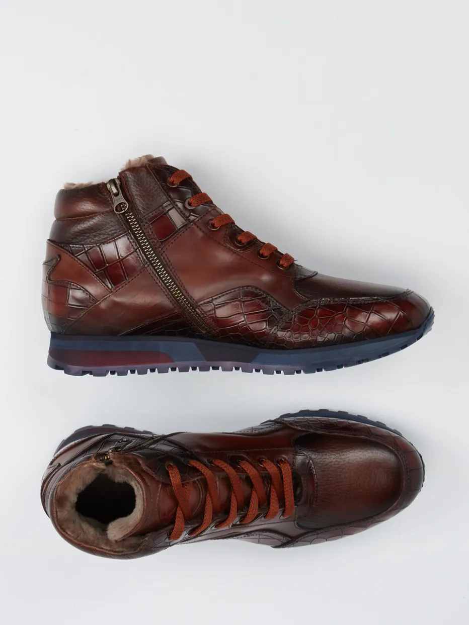 Diese gefütterten Schnürboots kombinieren glänzendes Kalbleder mit markanter Krokoprägung und sorgen durch die profilierte Sohle auch bei Winterwetter für sicheren Halt.