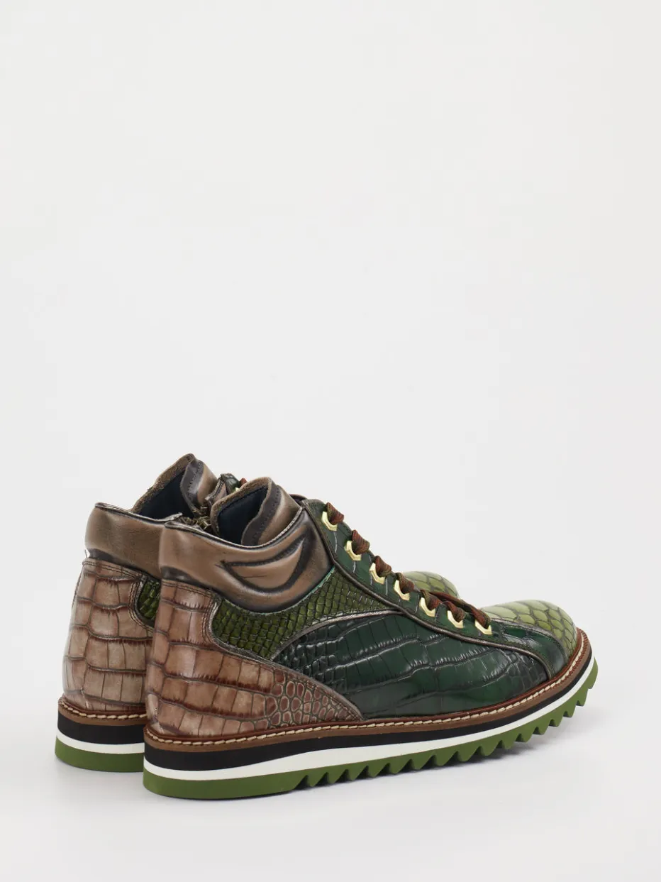 Konstantin Starke präsentiert urbane Schnürboots für alle, die individuelle Akzente setzen möchten. Die markante Kroko-Prägung auf dem geprägten Leder mit glänzendem Finish formt in Kombination mit goldfarbenen Metallösen und einem gezielten Farbverlauf in Waldgrün und Bronzebraun einen echten Stil-Hybrid. Ihr sportlich-voluminöser Mid-Top-Schnitt setzt auf Komfort und Ausdruck – unterstützt durch Schnürung plus Reißverschluss sowie eine profilierte Gummisohle mit Zickzack-Muster. Stilistisch trifft Retro-Hiking auf moderne Streetwear. Besonders stark in Kombination mit Oversized-Jackets oder Statement-Rucksäcken. Ein Schuh, der modische Selbstsicherheit und Qualität sichtbar vereint.