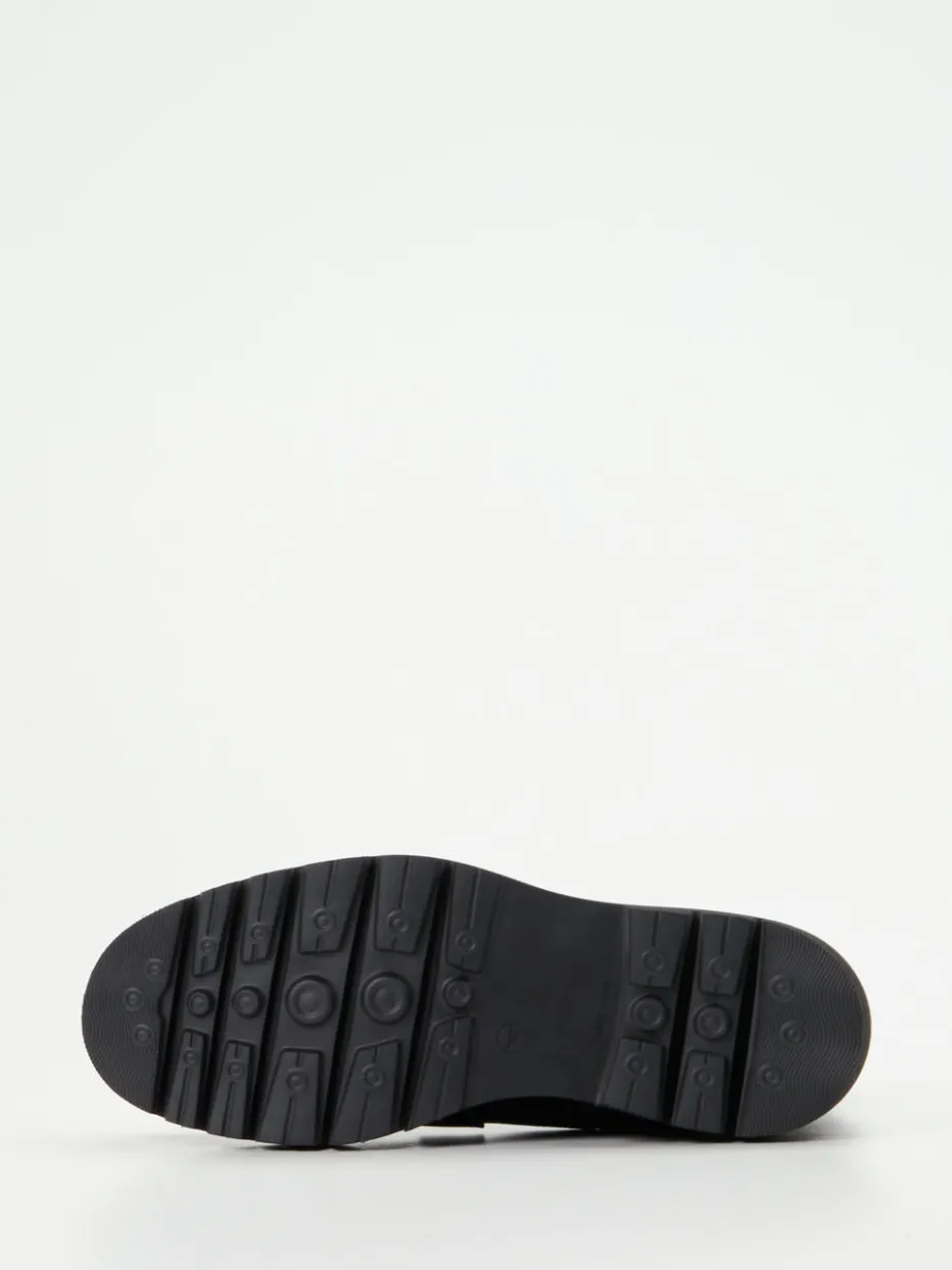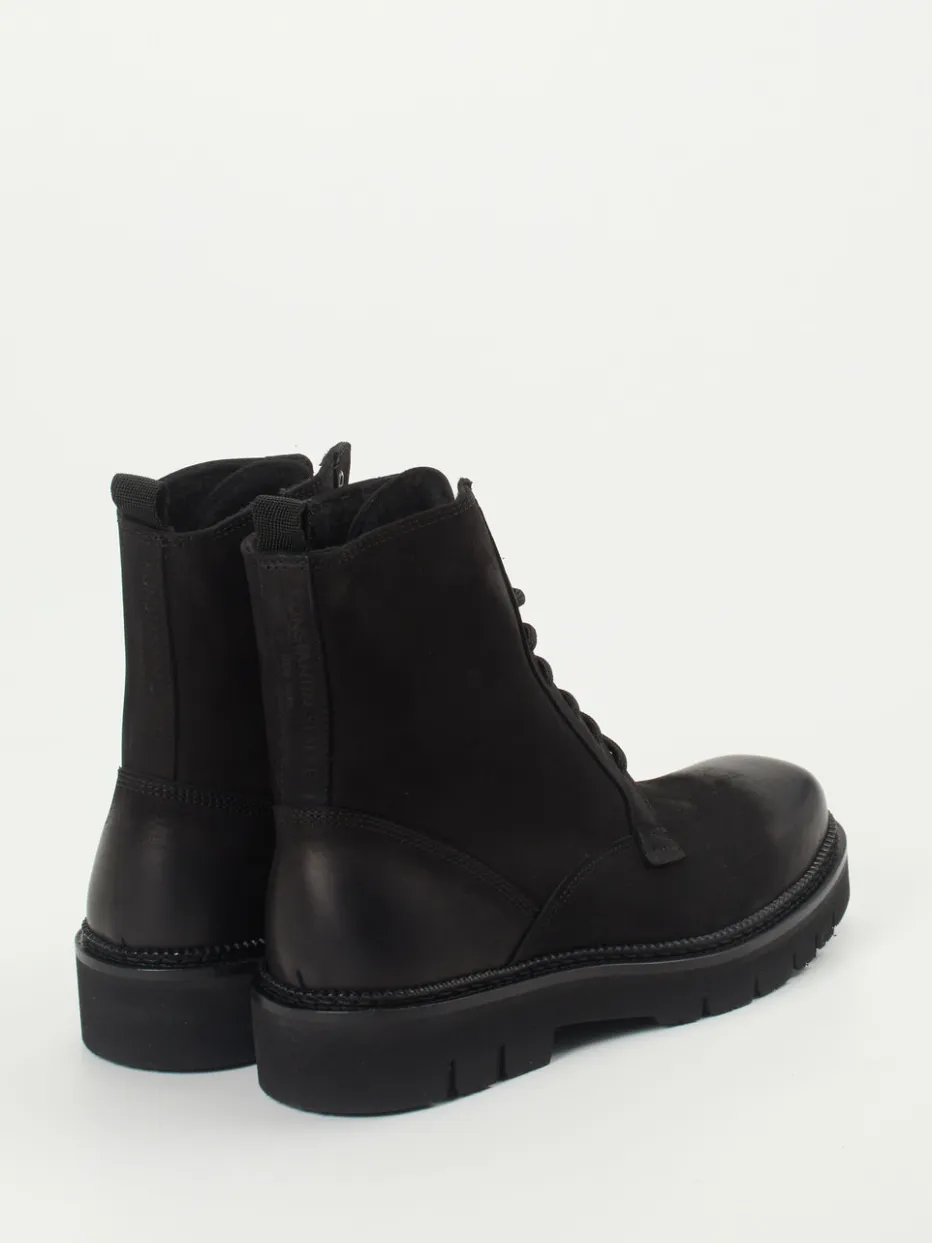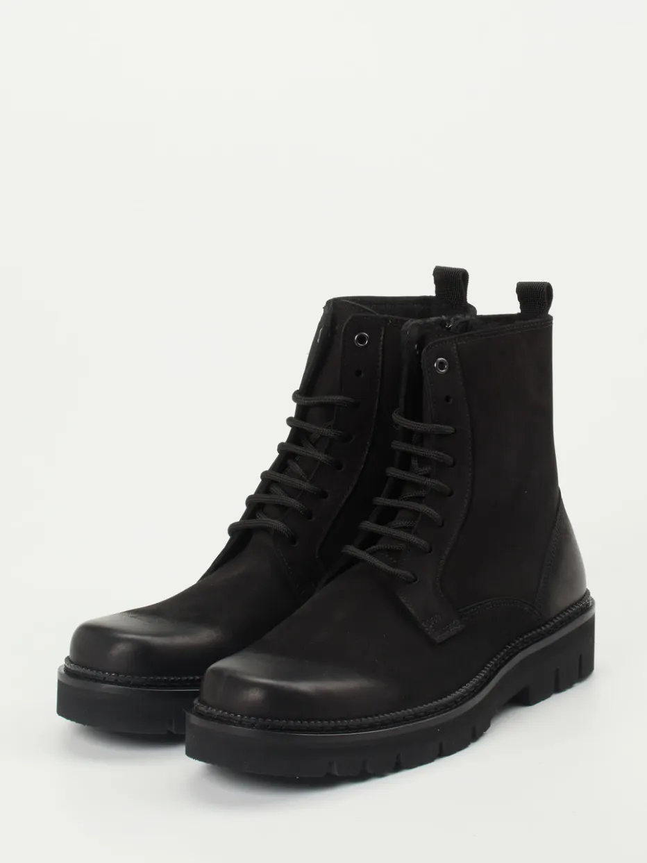Ideal für nasskalte Herbsttage in der City oder auf herbstlichen Spaziergängen. Schwarzes Nubukleder mit samtig angeschliffener Oberfläche und patinierten Partien an Spitze und Ferse kombiniert Langlebigkeit mit Style. Der hohe Schaft wird durch Schnürung und einen seitlichen Reißverschluss ergänzt, was An- und Ausziehen erleichtert. Die profilierte Gummisohle sorgt für sicheren Halt, das warme Textilfutter für angenehmen Tragekomfort. Eine textile Zuglasche an der Ferse rundet das Design funktional ab.