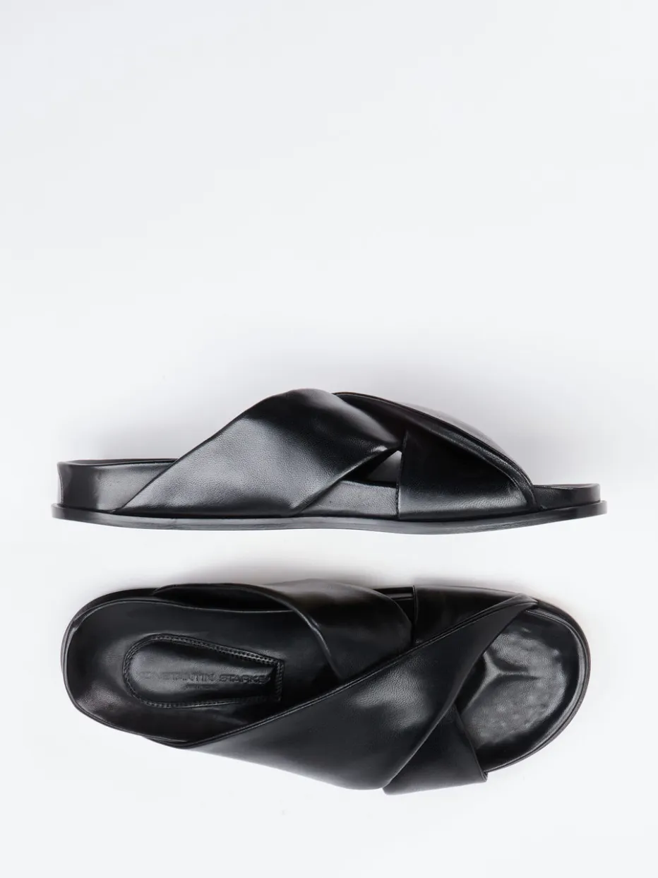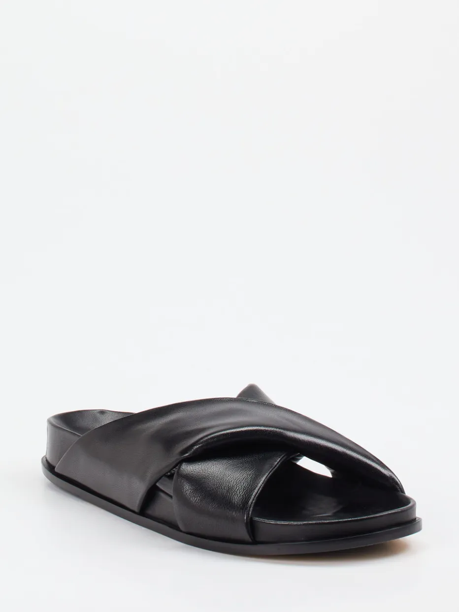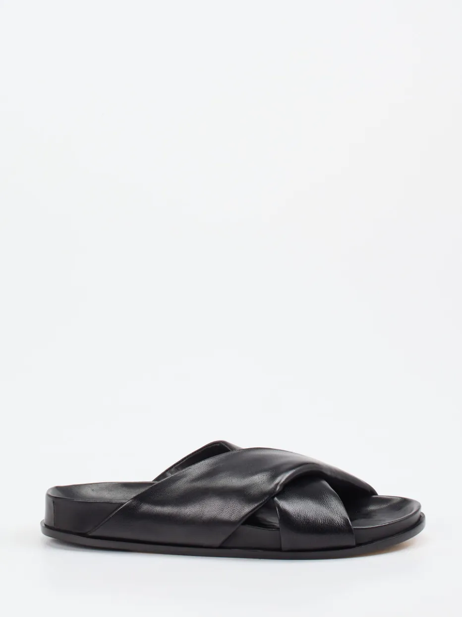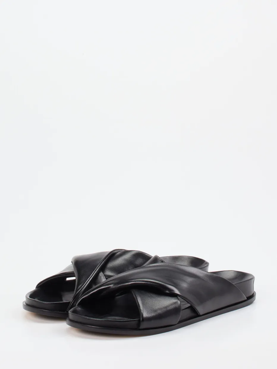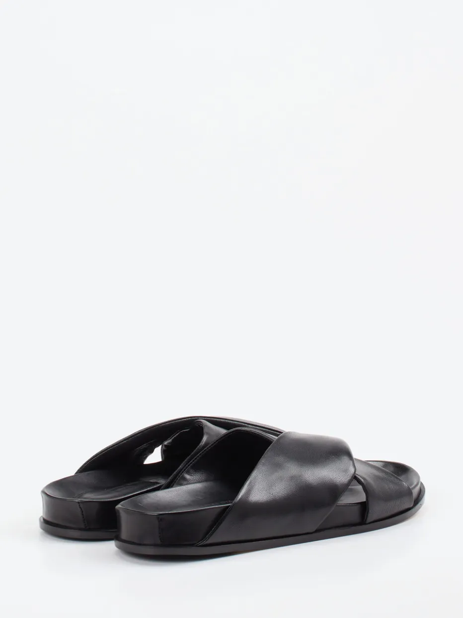 Schwarze Slides mit gekreuzten, weich gepolsterten Riemen in edlem Lammleder – ein stilvoller Begleiter für warme Tage. Für minimalistische Looks und moderne Komfortansprüche konzipiert.