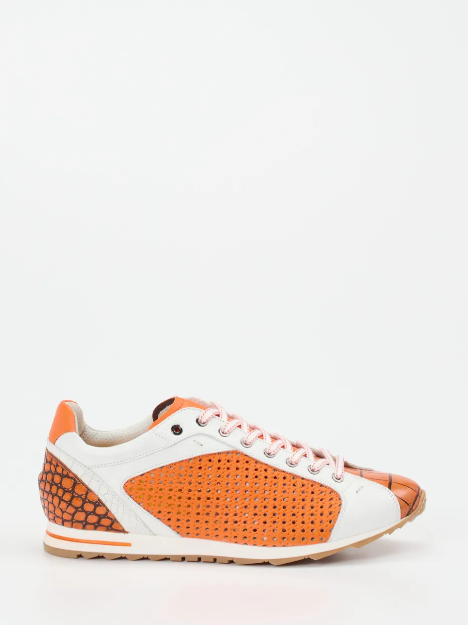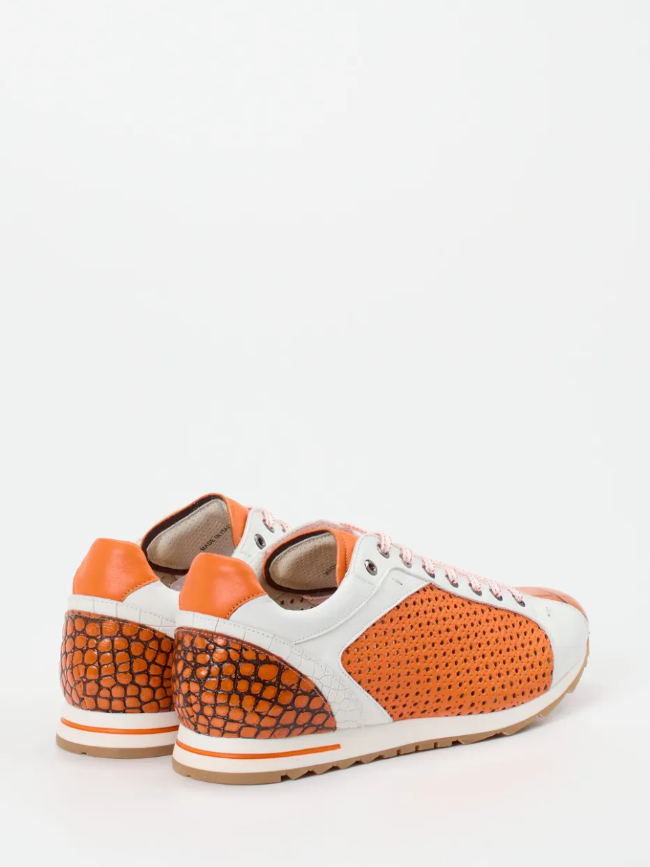 Markantes Design trifft auf Komfort.Konstantin Starke präsentiert einen Low-Top-Sneaker, der sportliche Linien mit auffälliger Ästhetik verbindet. Im Alltag oder auf Reisen setzt das Modell durch das geprägte Leder mit glänzender Reptilstruktur in kräftigem Orange einen akzentuierten Stilimpuls. Weißes Kalbleder, perforierte Partien und zweifarbige Schnürsenkel unterstreichen die dynamische Optik. Innen sorgt ein Lederfutter für angenehmen Tragekomfort, während eine profilierte Gummisohle sportliche Anleihen aufgreift. Farb- und Materialkontraste orientieren sich am Color-Blocking-Trend. Kombinierbar mit weißen Jeans oder hellen Jacken. Ein Statement-Sneaker mit trendstarkem Charakter von Konstantin Starke.