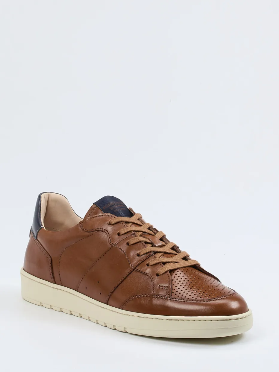 Der Sneaker aus cognacfarbenem Kalbleder verbindet klassische Form mit dezentem Streetwear-Akzent. Hochwertige Verarbeitung und geschmackvolle Details unterstreichen den eleganten Anspruch.