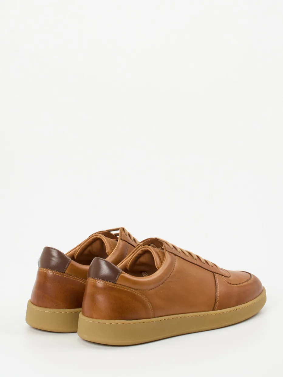Der Sneaker vereint edles Kalbleder in Cognac mit minimalistischer Linienführung und modernen Retro-Details – ein smarter Akzent für den urbanen Alltag.