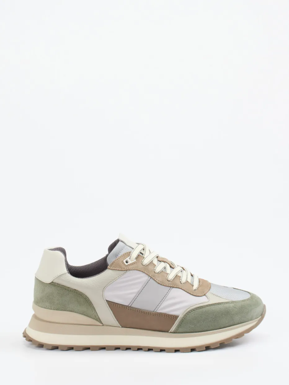 Ideal für urbane Freizeitlooks und entspannte Outdoor-Momente: Der Unisex-Sneaker ist aus feinem Veloursleder gefertigt, ergänzt durch samtig strukturiertes Mesh und glattes Glattleder. Das Design in Cremeweiß, Salbeigrün und Taupebraun wirkt harmonisch und liegt farblich ganz im Trend der „Muted Earth Tones SS24“. Die zweifarbige Schnürung und die verstärkte Ferse akzentuieren die sportliche Low-Cut-Silhouette. Dank griffiger Profilsohle und gepolstertem Wechselfußbett überzeugt das Modell auch funktional auf ganzer Linie.