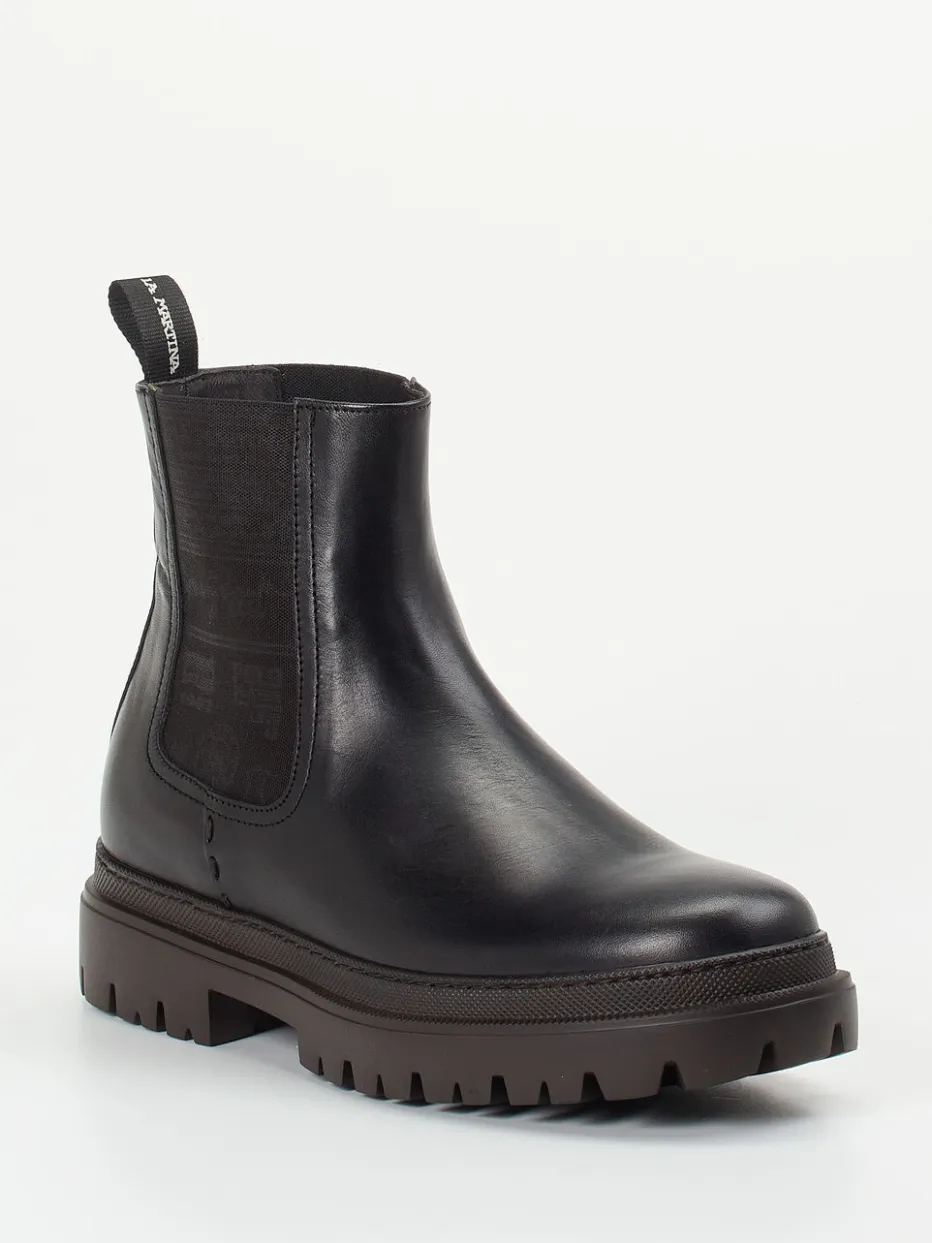Hochwertiges Kalbleder trifft auf klare Linienführung: Die Chelsea Boots von La Martina überzeugen mit robuster Profilsohle und dezenter Markeninszenierung.