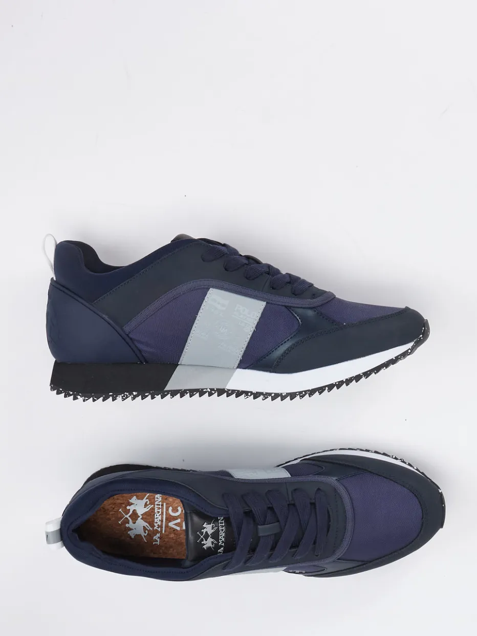 Retro-Style trifft moderne Funktion.La Martina erweitert die Herren-Kategorie um einen sportlichen Retro-Sneaker mit nachhaltigem Anspruch. Ideal für Freizeitaktivitäten und entspannte Outdoor-Momente bietet das matt strukturierte Textil-Obermaterial in Dunkelblau mit hellgrauen Akzenten ein stilvolles Erscheinungsbild. Die reflektierenden Applikationen und das geprägte Seitenlogo unterstreichen den progressiven Look. Die gesprenkelte Profilsohle aus Gummi sorgt für Trittsicherheit, während das gepolsterte Fußbett angenehmen Komfort liefert. Inspiriert vom Gorpcore- und Retro-Sportswear-Trend lässt sich das Modell hervorragend mit Cordhosen oder Funktionswear kombinieren. Ein vielseitiger City-Sneaker mit sportlicher DNA, nachhaltiger Fertigung und markentypischer Authentizität.