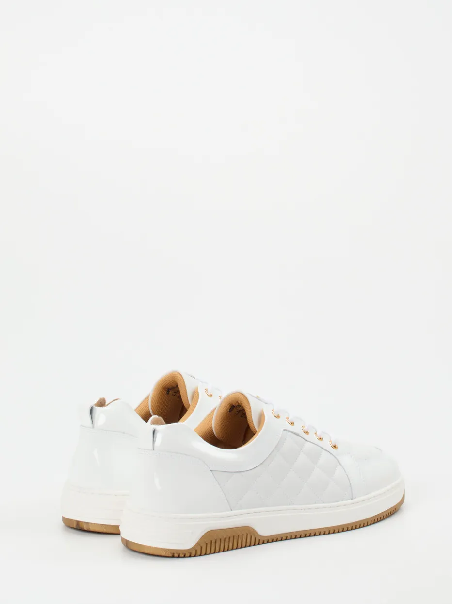 Dieser Sneaker kombiniert luxuriöses Kalbleder mit dezenter Steppung und goldfarbenen Ösen – ein stilvoller Hybrid aus Streetstyle und Business Casual.