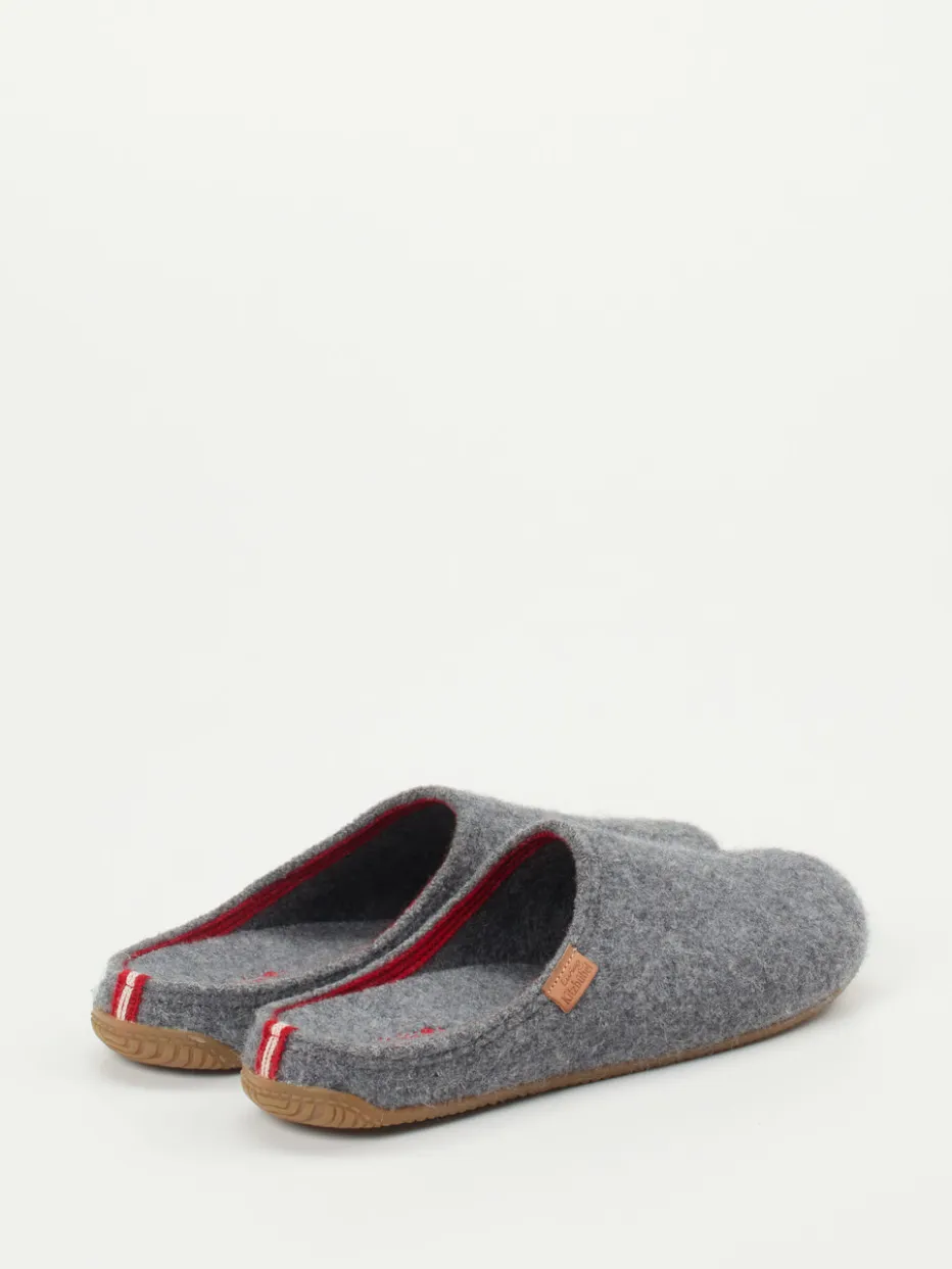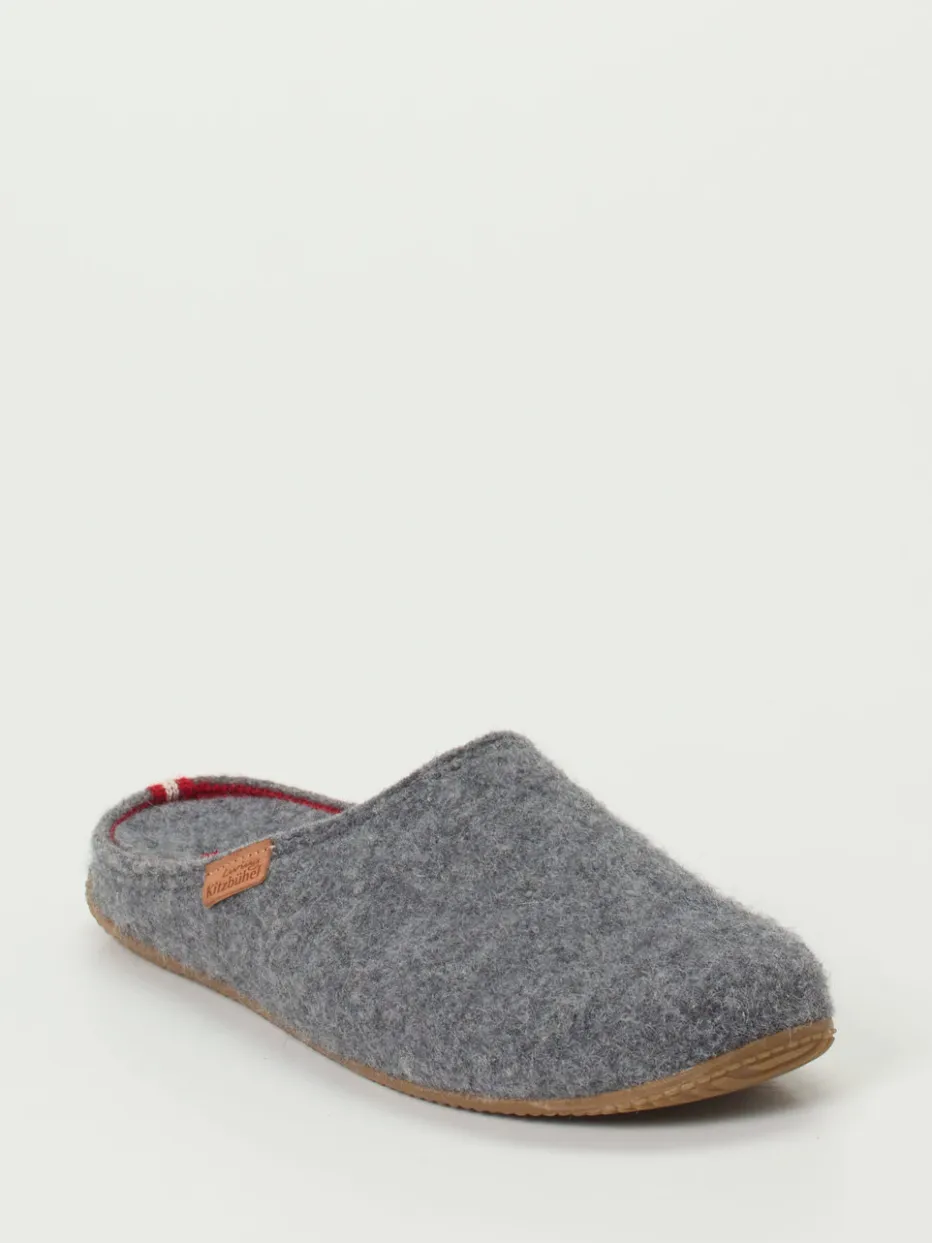 Natürlich warmer Hausschuhkomfort in alpiner Formensprache. Die Pantolette überzeugt mit hochwertiger Wollfilzqualität, rutschhemmender Gummisohle und entspanntem Design.