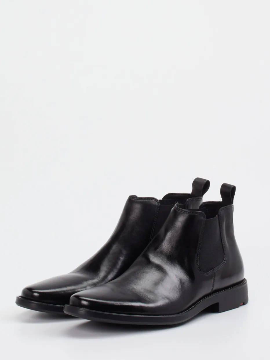 Stil mit Understatement.Die Marke Lloyd bringt mit diesen Herren-Stiefeletten eine klassische Chelsea Boot-Variante auf den Punkt. Für einen souveränen Auftritt im Büro oder im Alltag sorgen die schwarze Farbgebung, die glänzende Oberfläche aus edlem Kalbleder sowie die charakteristische Silhouette mit seitlichen Elastikeinsätzen und Zuglasche. Als funktionales Detail überrascht die Gummisohle mit einer feinen roten Akzentlinie. Im Sinne eines minimalistischen Designverständnisses fügt sich das Modell nahtlos in Trends wie Quiet Luxury und Black Basics ein. Kombiniert mit Anzughose oder Jeans entfaltet es seine vielseitige Wirkung. Ein fein verarbeiteter, kompromisslos stilvoller Begleiter für urbanorientierte Looks.