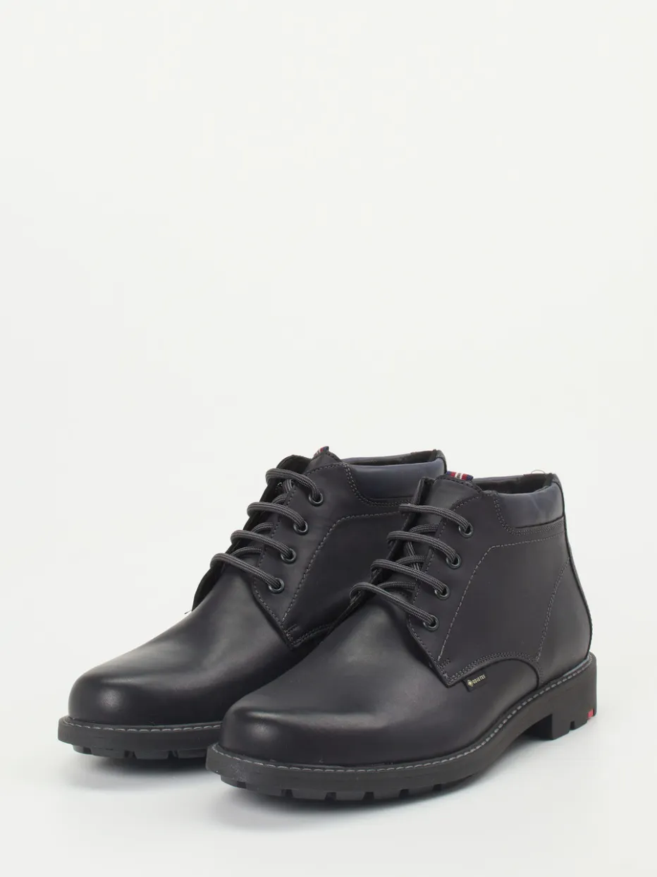 Wenn es draußen nass und windig ist, punktet dieses Modell mit seinem wind- und wasserdichten Glattleder in mattem Schwarz, ergänzt durch eine integrierte GORE-TEX-Membran. Die knöchelhohe Silhouette zeigt sich schnörkellos und betont durch tonale Ziernähte sowie ein dezentes Label. Innen sorgt ein wärmendes Lammfellfutter für Komfort, außen gewährleistet eine kräftig profilierte Gummisohle Trittsicherheit. Der gepolsterte Schaftrand und die individuelle Schnürung runden die Alltagstauglichkeit ab. Die Kombination aus Funktionalität und urbaner Zurückhaltung passt besonders zu wetterfesten Casual-Looks.