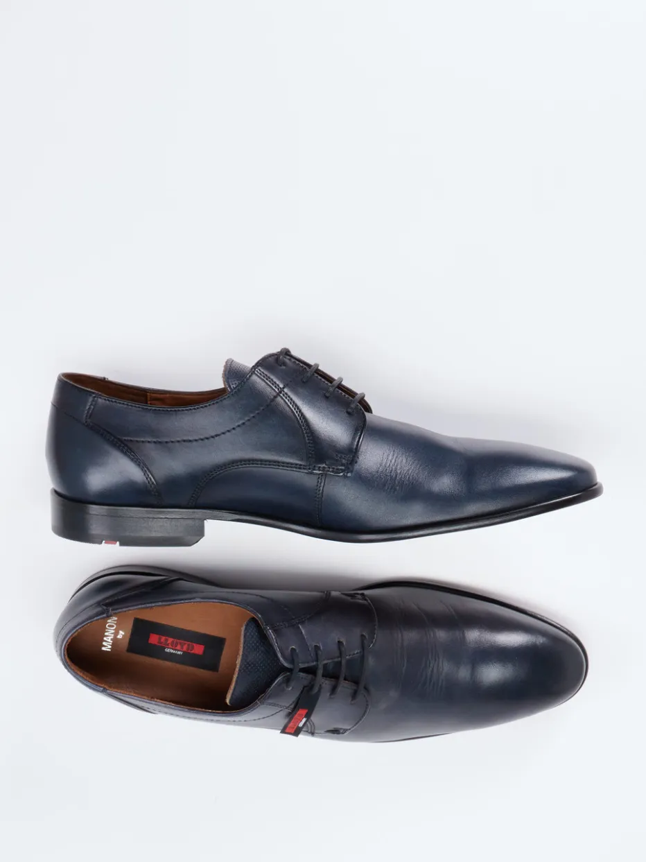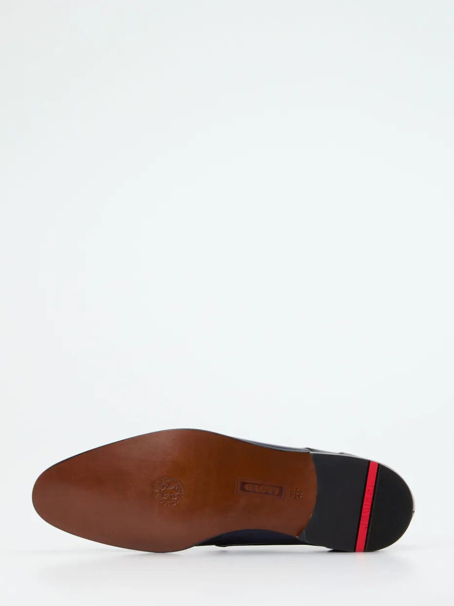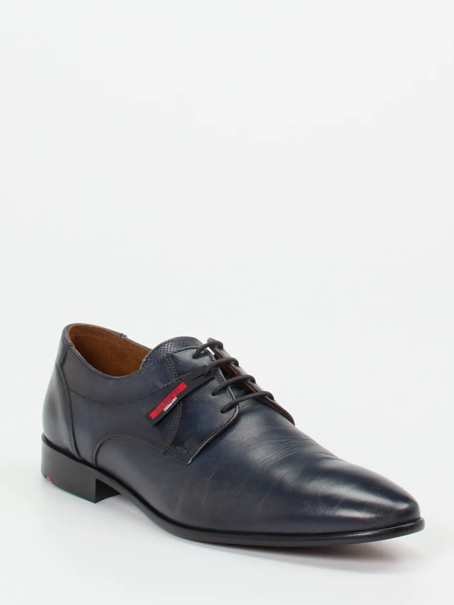 Stilsicher durch den Business-Alltag.Lloyd präsentiert mit diesem Herrenschuh einen klassischen Derbyschnürer in edlem Design. Für formelle Anlässe bietet das glanzvoll verarbeitete Kalbleder in Dunkelblau eine elegante Lösung. Der schmal zulaufende Leisten, die feine Nahtführung und die perforierte Lasche akzentuieren das minimalistische Gesamtbild. Ausgestattet mit Lederlaufsohle, gummiertem Absatz und komfortablem Fußbett überzeugt das Modell auch funktional. Stilistisch fügt es sich ideal in den Trend „Quiet Luxury“ ein und passt zu Businesshose wie Anzug gleichermaßen. Ein überzeugender Auftritt – mit langlebiger Lloyd-Qualität.