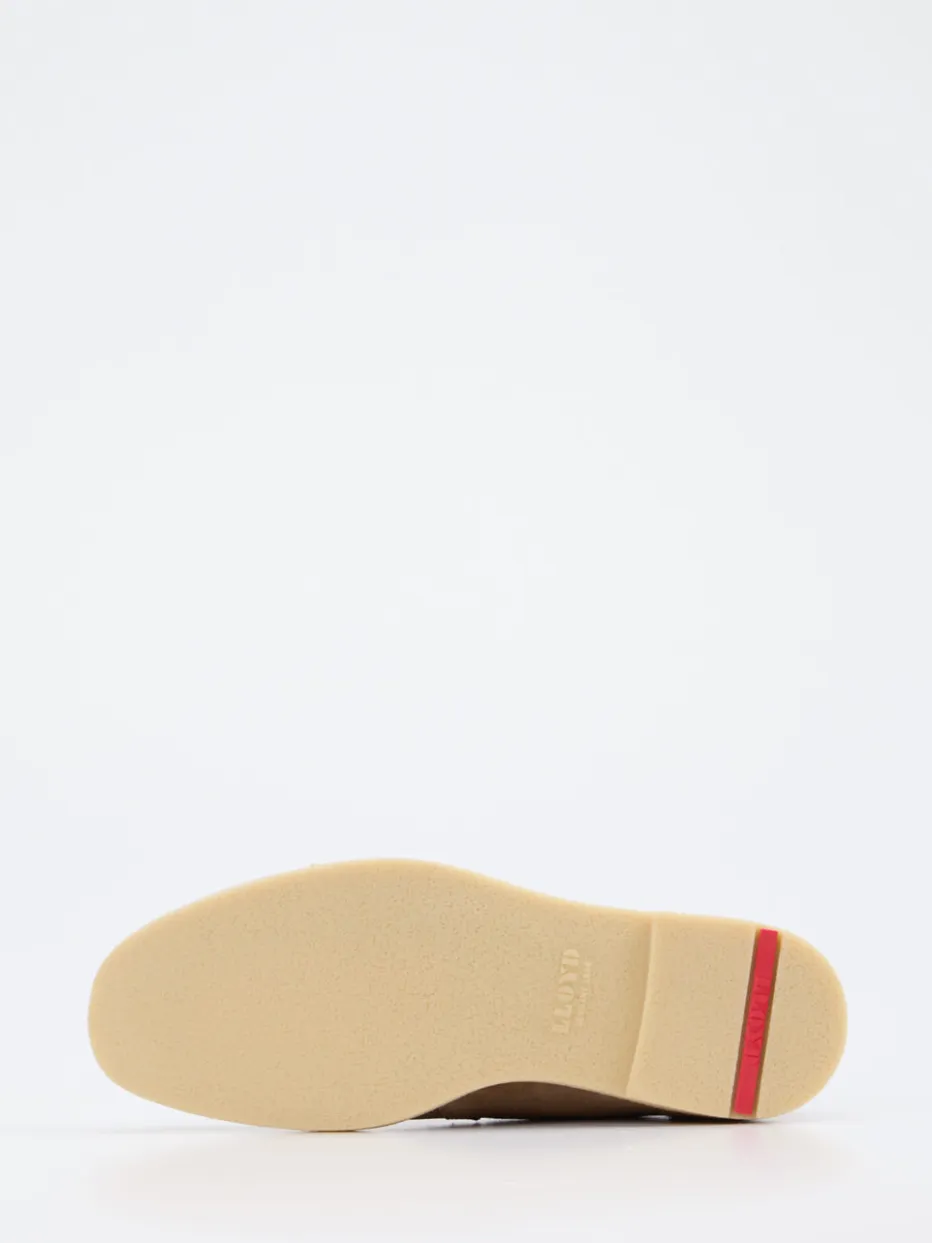 Die Herren-Desert Boots von Lloyd vereinen klassisches Design mit smartem Understatement. Gefertigt aus hochwertigem Veloursleder, das samtig angeschliffen und in einem edlen Sandbeige gehalten ist, präsentieren sie sich knöchelhoch mit zwei dezenten Ösen und Ton-in-Ton-Nähten. Die helle Gummisohle, der sanft abgerundete Leisten und eine feine Fersenlasche mit Streifendetail unterstreichen den klaren Look. Die Lederfütterung sorgt für angenehmen Tragekomfort – ideal für Alltag wie Büro. Ein Schuh im Zeichen von „Quiet Luxury“ und Natural Tones.