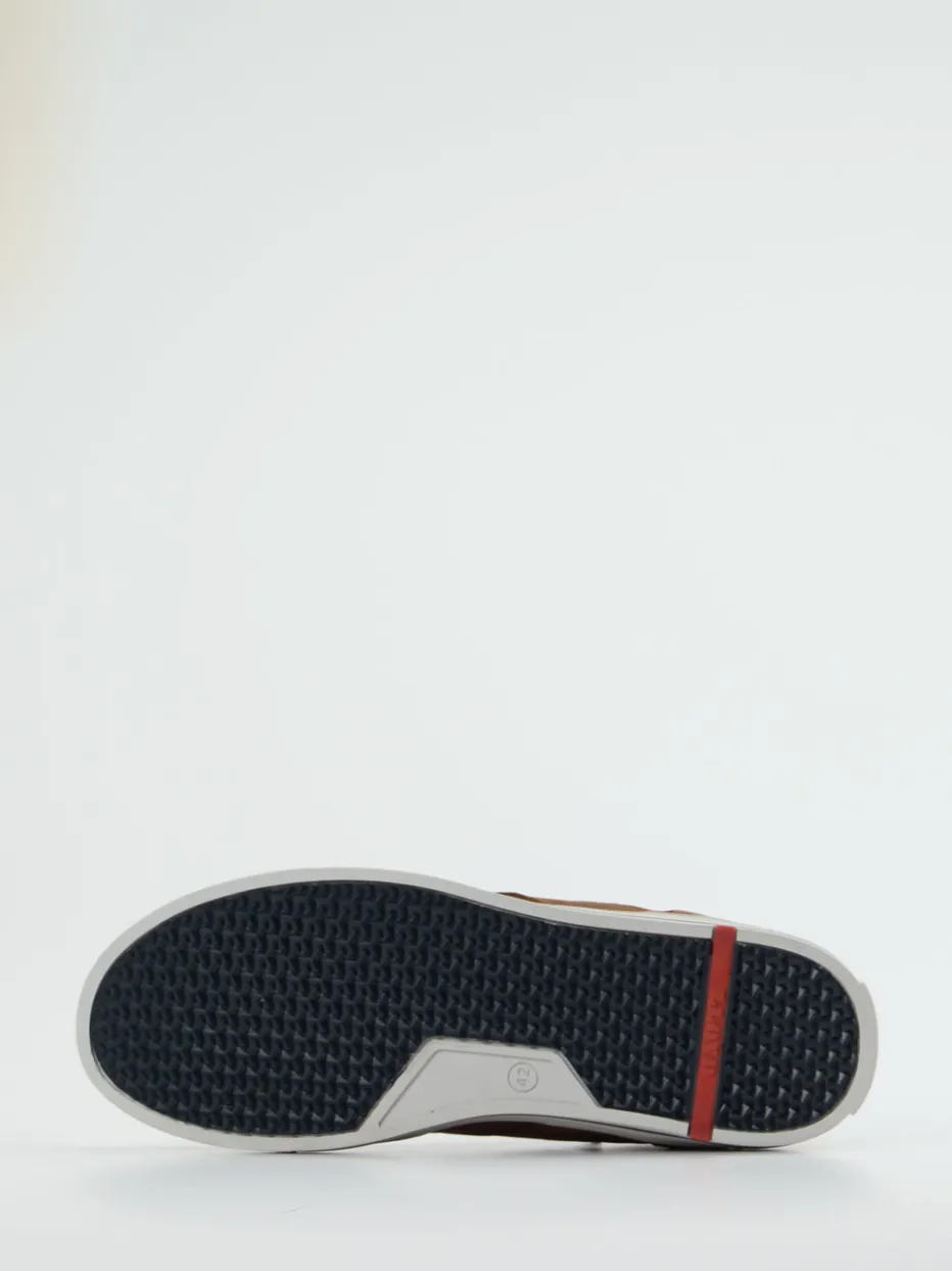 Für herbstliche Citytouren bietet das schokoladenbraune Kalbleder mit samtig-matter Oberfläche ein stilvolles Erscheinungsbild und angenehme Haptik. Der hellgraue, gepolsterte Filzkragen und das weiche Textilfutter erhöhen den Tragekomfort an kühleren Tagen. Die zweifarbige Gummisohle mit Kontraststreifen sorgt für Stabilität auf urbanem Untergrund. Das seitlich integrierte Markenlabel unterstreicht den dezenten Look. Ideal für Casual-Styles mit Chino oder Jeans.