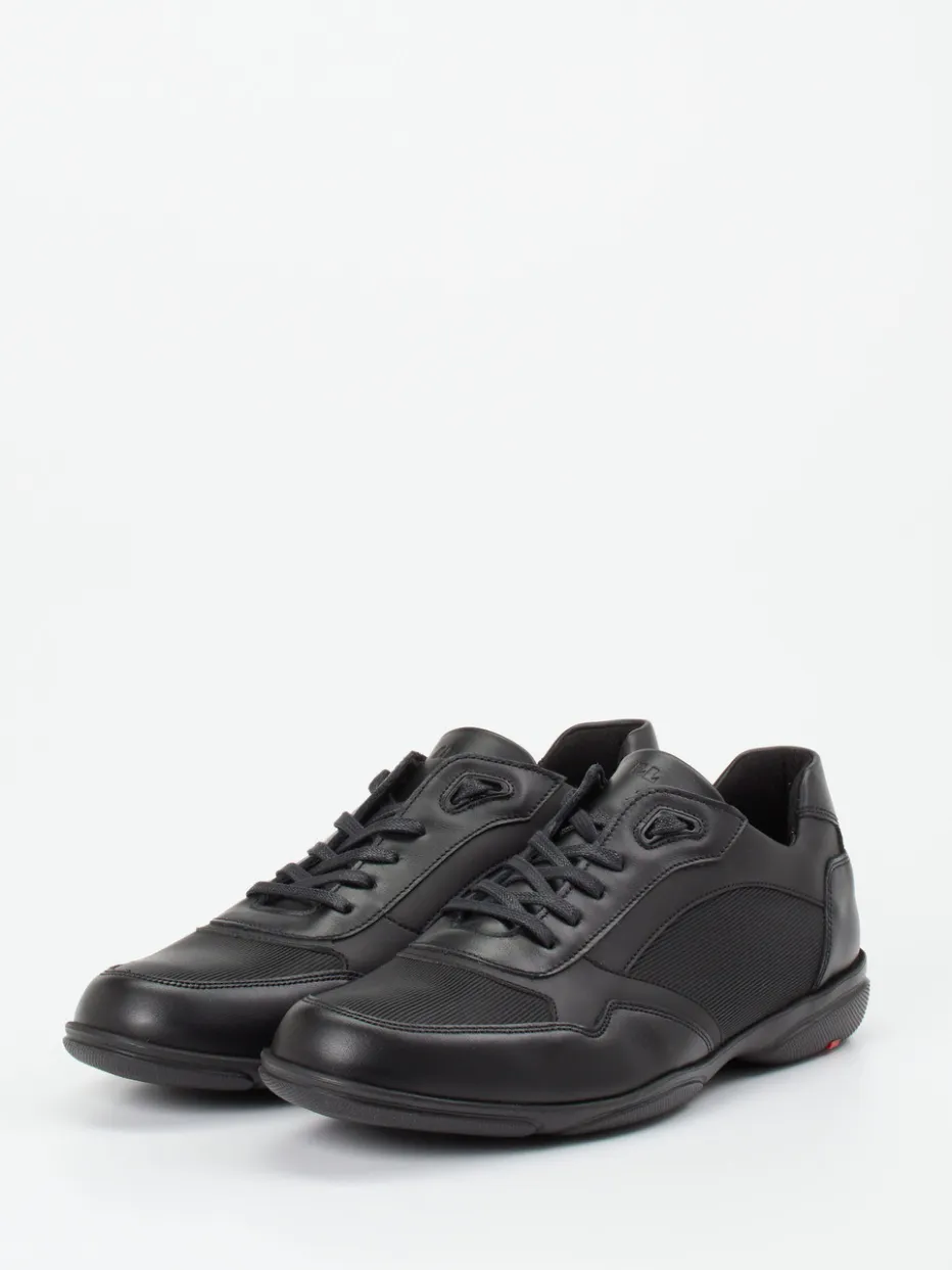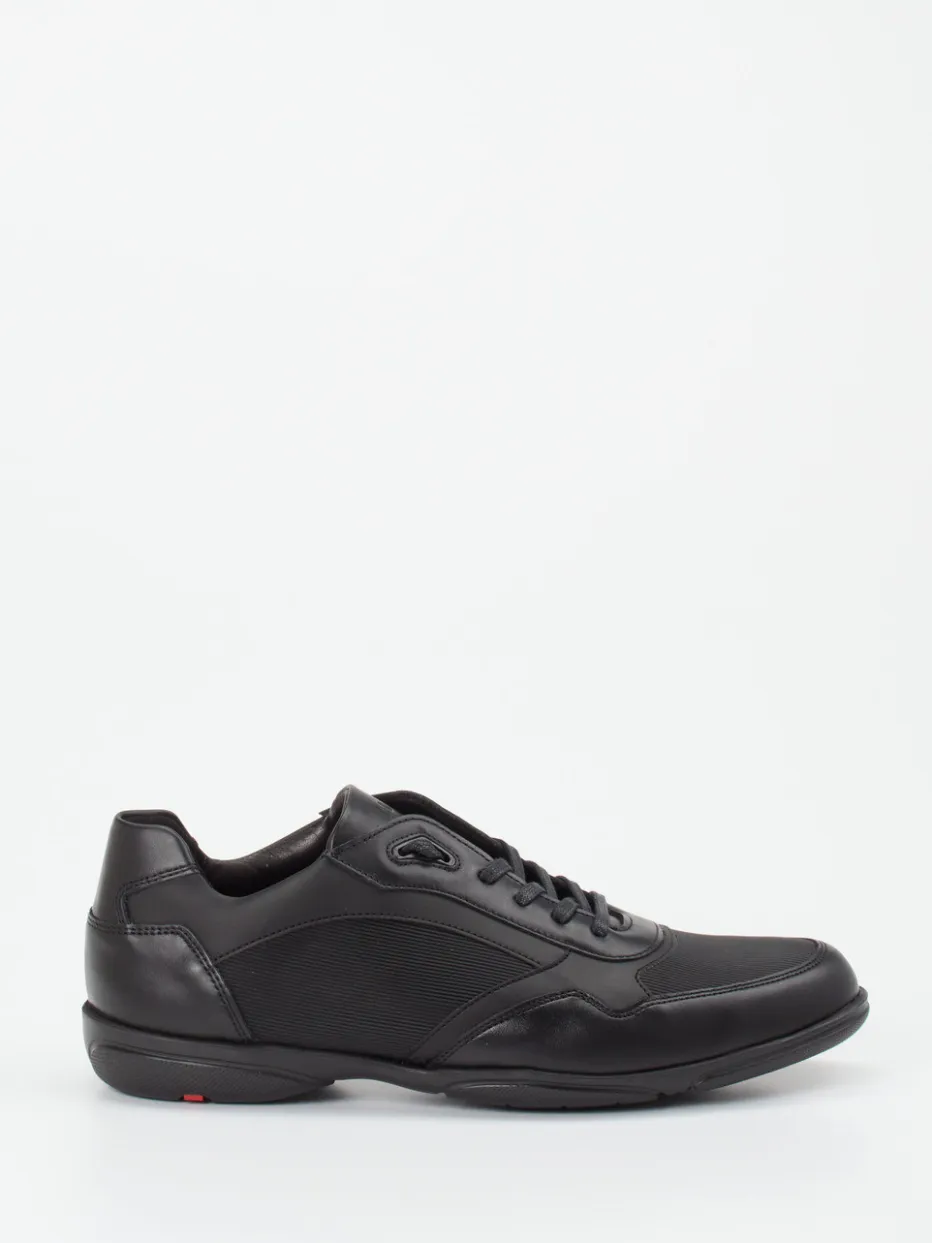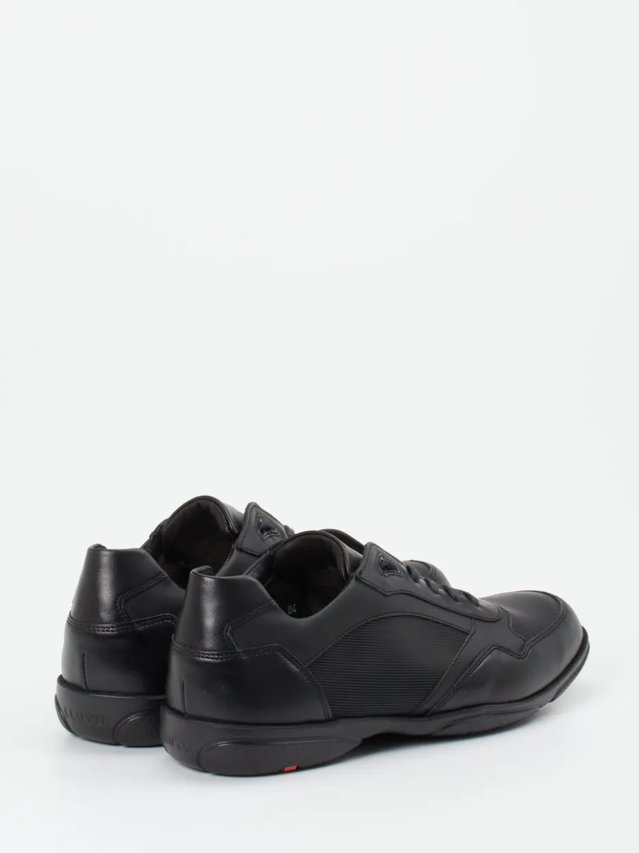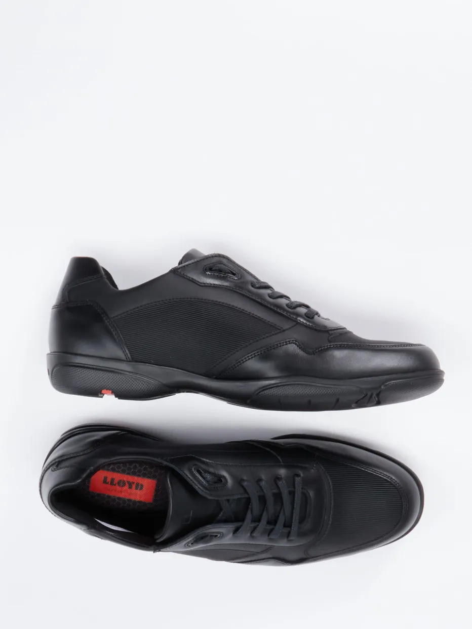Stilvolle Reduktion fürs urbane Leben.Lloyd präsentiert mit diesem Casual Sneaker einen komfortbetonten Herrenschuh für Alltag und Berufsumfeld. Die klassische Kombination aus schwarzem Kalbleder und matt strukturiertem Textil-Mesh unterstreicht den dezenten, urbanen Stil. Die klar sportliche Linienführung wird ergänzt durch gepolsterten Schaftrand und strukturierte Seitenpanels. Dezente Markenprägungen auf der Lasche und eine ergonomisch profilierte Gummisohle mit rotem Akzent verbinden Funktionalität mit stilistischer Finesse. Im Trendsegment „Quiet Comfort“ angesiedelt, überzeugt der Sneaker durch klare Ästhetik und variablen Tragekomfort – auch für Einlagen geeignet. Ein vielseitiger Schuh mit LLOYD-typischer Materialqualität und urbaner Eleganz.