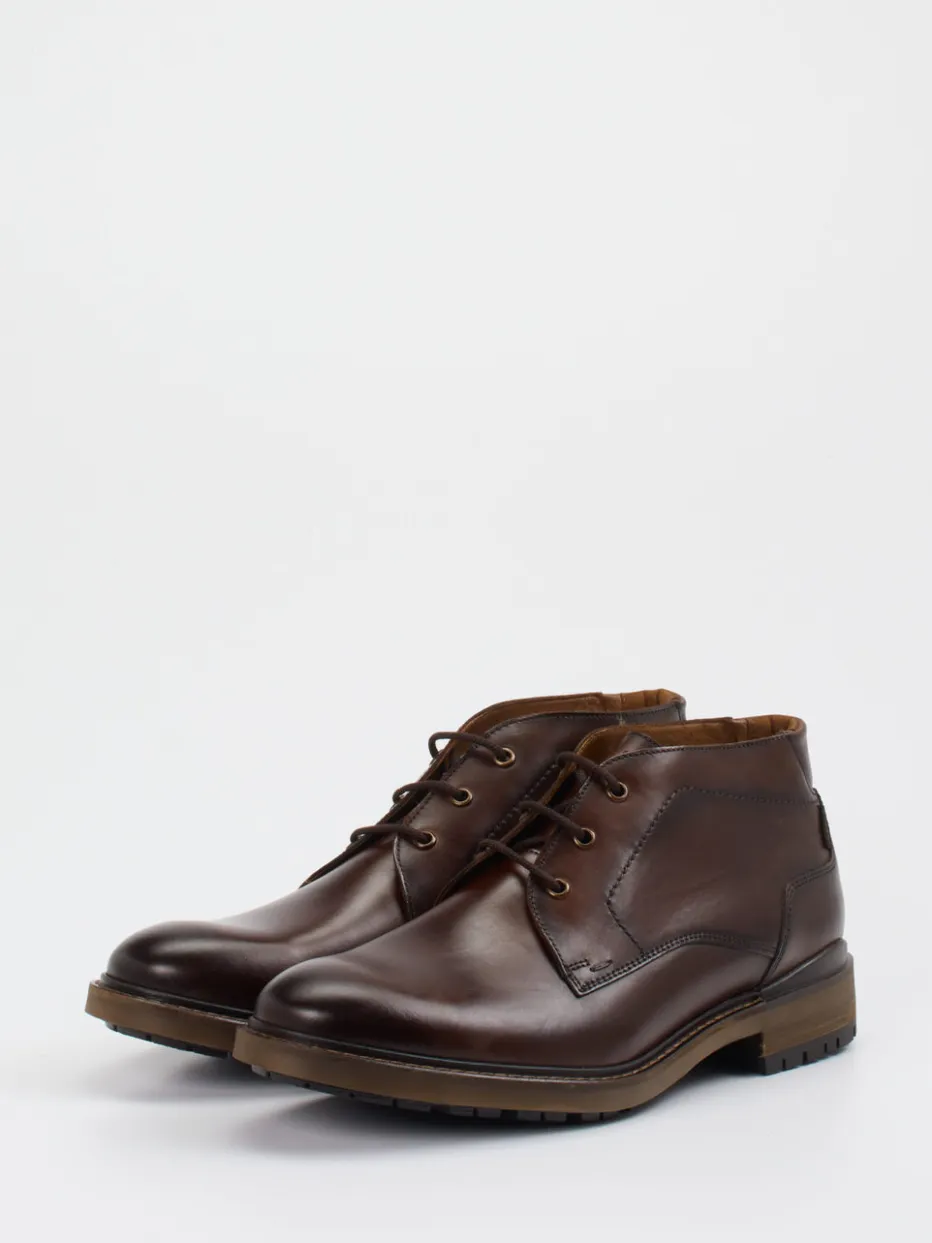 Bei wechselhaftem Wetter sorgt die GoreTex-Ausstattung für Schutz vor Nässe und Wind, während das weich wärmende Wollfutter Komfort bietet. Das dunkelbraune Kalbleder begeistert mit glanzvollem Finish, harmoniert mit bronzefarbenen Ösen und setzt durch kontrastierende Nähte handwerkliche Akzente. Die klassische, knöchelhohe Form mit robuster Profilsohle verbindet Funktionalität mit maskulinem Designanspruch und passt in Büro wie Freizeit. Besonders stimmig zu hellen Kaschmirpullovern oder dunklen Wollhosen.