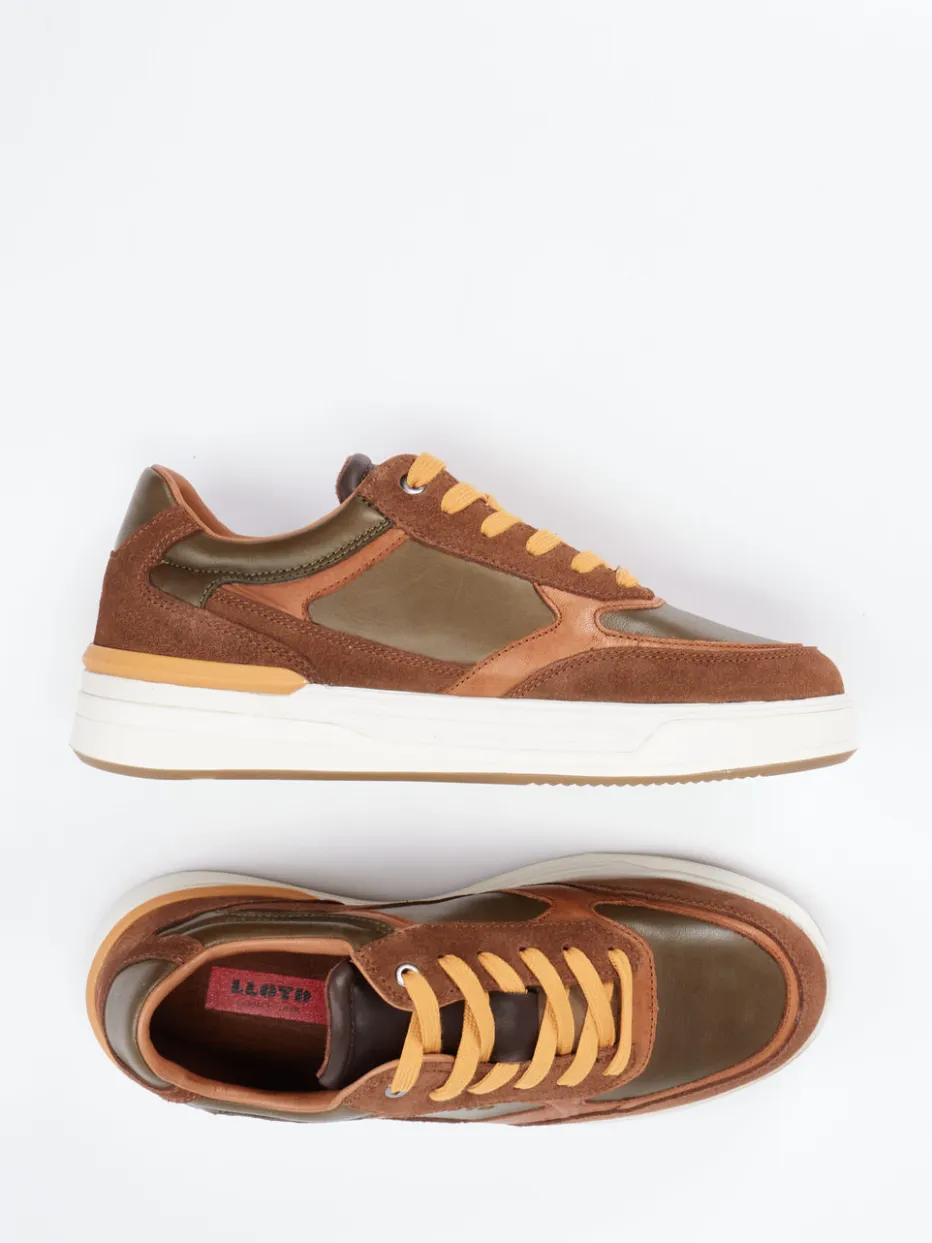 Stilsicher durch den Herbst.Lloyd interpretiert den klassischen Low-Top Sneaker im lässig-eleganten Herrenstil. Ideal für entspannte Stadtspaziergänge oder den Weg ins Lieblingscafé: Das Modell kombiniert hochwertiges Kalbleder mit samtig angeschliffenem Veloursleder. Die warme Farbpalette aus Olivgrün, Mittelbraun und Senfgelb unterstreicht den herbstlichen Streetstyle-Charakter. Schnürung, gepolsterter Schaftrand und herausnehmbares Fußbett bieten angenehmen Komfort, während die profilierte Gummisohle Griffigkeit garantiert. Der goldfarbene Logoprint und Ton-in-Ton-Nähte setzen dezente Akzente. Getragen zur Cordhose oder Steppjacke entfaltet der Retro-Look seine Wirkung. Ein vielseitiger Allrounder mit markentypischer Wertigkeit und Stilbewusstsein.