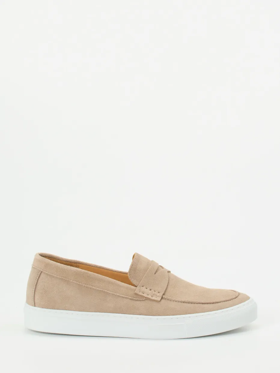 Minimalismus trifft Handwerk.Ludwig Reiter präsentiert mit diesem Hybrid-Loafer ein unverwechselbar stilvolles Herrenmodell für Freizeit und Büro. Das taupefarbene Veloursleder zeigt sich samtweich und matt, während die klare, flache Silhouette für moderne Nonchalance sorgt. Die Zunge ist mit einem klassischen Loafer-Detail akzentuiert, ergänzt von Ton-in-Ton-Nähten und einer weißen Kontrast-Gummisohle mit feinem Profil. Innen überzeugt weiches Kalblederfutter mit gepolstertem Fußbett. Die Hybrid-Bauweise vereint Eleganz und Komfort – perfekt für Casualwear im minimalistischen Quiet-Luxury-Look. Lässt sich ausgezeichnet zu Chinohosen oder Leinenhemden kombinieren. Feinste Machart mit urbanem Anspruch – typisch Ludwig Reiter.