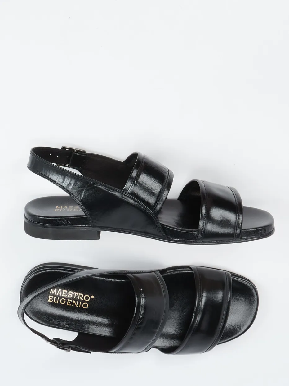 Sommerlicher Minimalismus mit italienischer Seele.Die Herrensandalen von Maestro Eugenio sind ein Paradebeispiel für Eleganz in reduzierter Form. Ideal für entspannte Stadtspaziergänge oder stilvolle Ferientage bietet das Modell dank verstellbarem Fersenriemen und ergonomischer Innensohle angenehmen Tragekomfort. Gefertigt aus sanft glänzendem, schwarzem Ziegenleder verbinden sich handwerkliche Raffinesse und puristisches Design zu einem Klassiker. Silberfarbene Metallschnallen setzen dezente Akzente; die flache Silhouette mit Lederlaufsohle und sichtbar geprägtem „Vero Cuoio“-Siegel unterstreicht die Herkunft aus italienischer Traditionsfertigung. Inspiriert von „Quiet Luxury“ passt dieses Paar besonders gut zu Leinenhosen und cleanen Sommerlooks. Ein Klassiker italienischer Stilkultur für die warmen Monate.
