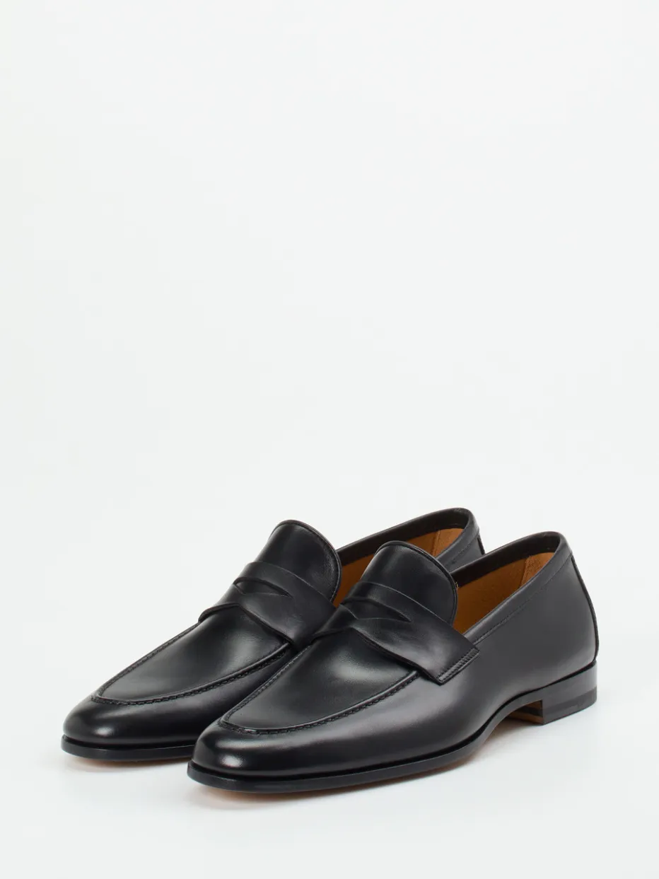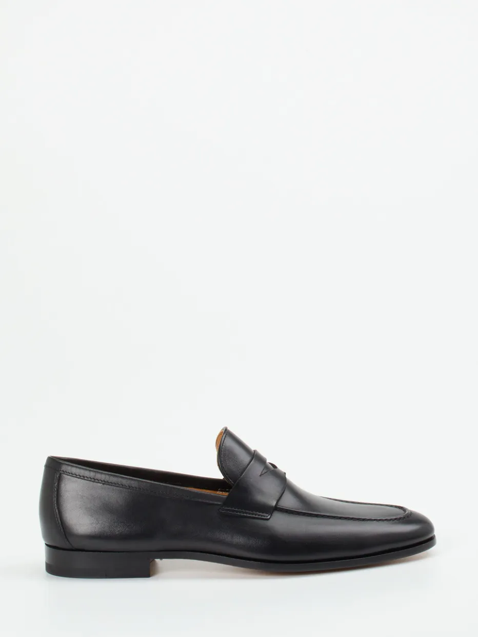 Klassik trifft auf modernen Minimalismus.Magnanni präsentiert einen Herren-Penny Loafer, der mit zurückhaltender Raffinesse überzeugt. Für den souveränen Business-Look oder elegante Abendveranstaltungen bietet dieser Slipper aus schwarzem Kalbleder ein glänzendes Finish und eine klassisch-schmale Silhouette. Die dezente Mokassinnaht auf dem Blatt und die offenkantige Penny-Bride setzen feine Akzente. Dank hochwertigem Lederfutter und gepolstertem Fußbett ist komfortabler Sitz garantiert, während die handgefertigte Ledersohle mit Gummieinsatz für Stabilität sorgt. Im Stil von „Quiet Luxury“ ergänzt er moderne Tailoring-Outfits perfekt. Ein formvollendeter Begleiter mit traditionsreicher Markenästhetik.
