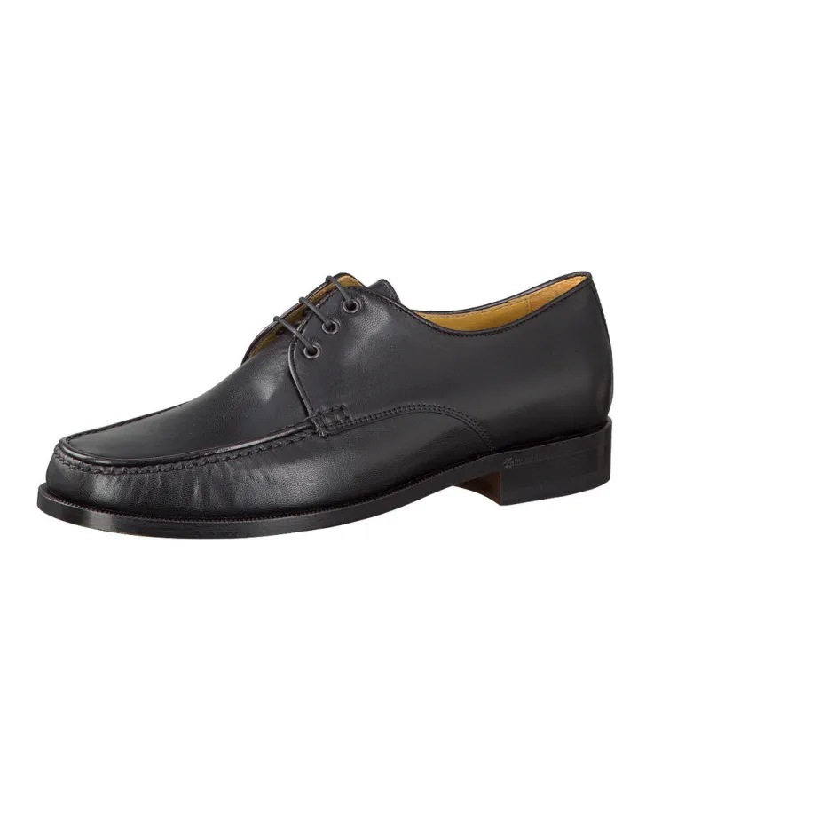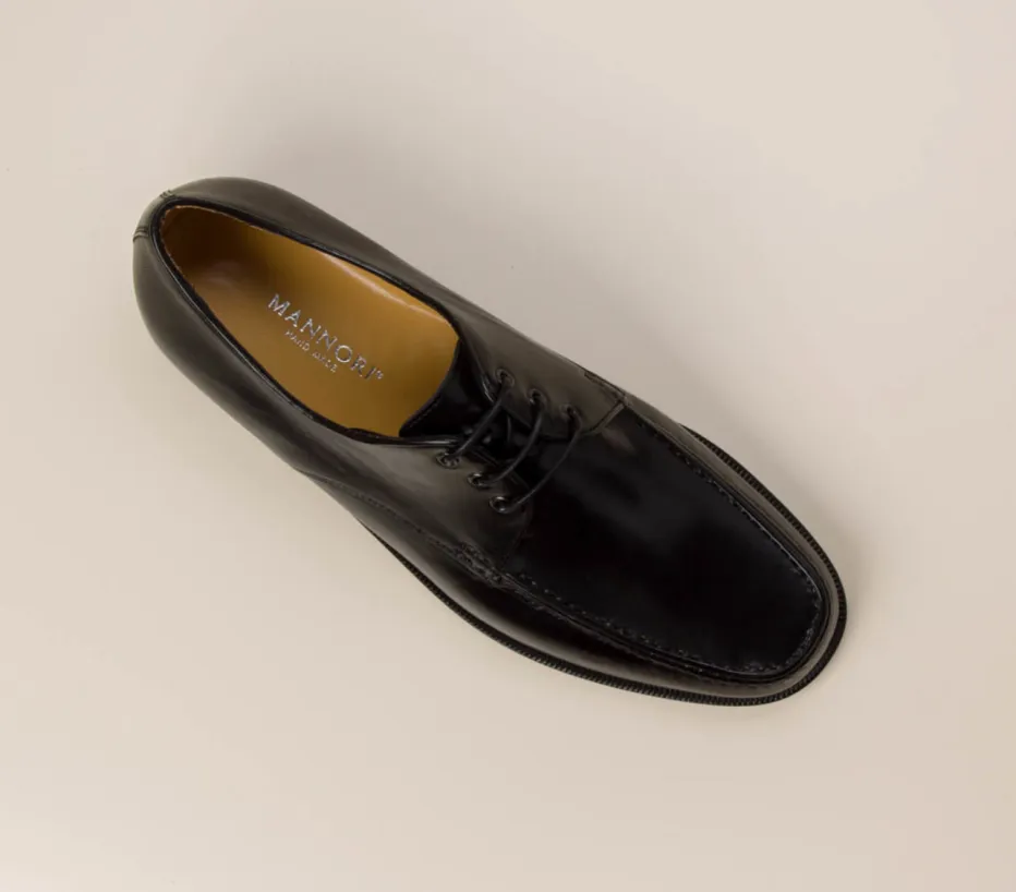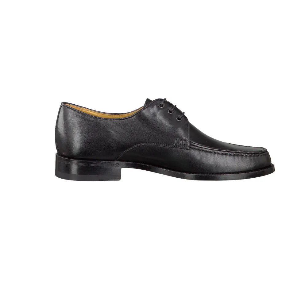 Schwarz und stilvoll zugleich.Mannori interpretiert den klassischen Herren-Schnürschuh als eleganten Derby mit handwerklichem Feinsinn. Für stilbewusste Business-Tage oder formelle Anlässe bietet dieser Derbyschuh aus schwarzem, glänzendem Ziegenleder überzeugende Qualität. Die leicht eckige Vorderpartie, dezente Ton-in-Ton-Nähte und das beigefarbene Innenfutter runden das puristische Design ab. Mit hochwertiger Ledersohle, rahmengenähter Konstruktion und handgefertigter Verarbeitung aus Italien steht er für höchste Ansprüche in Materialien und Stil. Der Schnürverschluss mit vier Ösen betont die klassische Linie. Ideal kombinierbar mit Anzug oder schmaler Stoffhose. Ein Schuh für kompromisslose Ästhetik und handwerkliche Exzellenz.