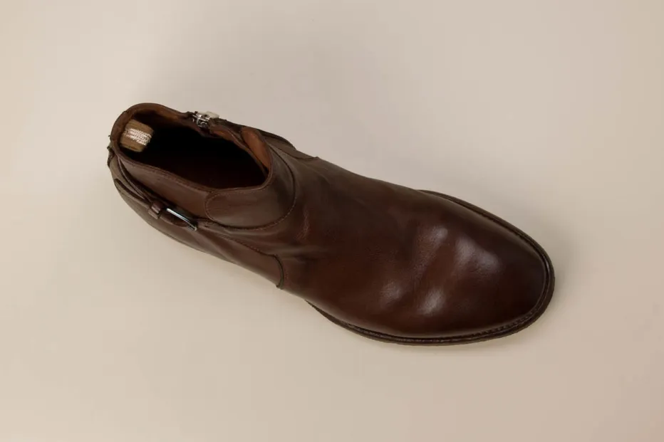 Herbststiefel mit Charakter.Officine Creative interpretiert klassische Herren-Ankle-Boots aus edlem Kalbleder neu. Ob im Business-Alltag oder in herbstlicher City-Kulisse – diese mittelbraunen Stiefeletten bieten souveränen Stil mit kompromissloser Qualität. Das glatte Kalbleder zeigt eine dezente Narbung und matten Patina-Effekt, charaktervoll betont durch eine antik anmutende Metallschnalle am Schaft. Ein innenliegender Reißverschluss sorgt für Komfort beim Anziehen, während die Gummisohle mit Profil sicheren Halt garantiert. Die klassische, knöchelhohe Silhouette wirkt zeitlos und maskulin. Gut kombinierbar mit Wollhosen oder dunkler Denim für einen smart-urbanen Look. Ein stilvoller Begleiter mit italienischer Noblesse und funktionaler Substanz.