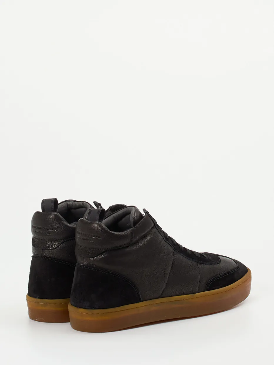 Retro trifft Urban-Minimalismus.Officine Creative präsentiert mit diesem Herren-High-Top-Sneaker ein Design voller Charakter. Ideal für kühle Tage in der Stadt, kombiniert das Modell schwarzes, leicht glänzendes Kalbleder mit samtig angeschliffenem Veloursleder – gekonnt kontrastiert von einer bernsteinfarbenen Gummisohle. Die klassische, schmale Silhouette mit gepolstertem Schaft und Zuglasche sorgt für komfortablen Halt im Alltag. Eine Fütterung aus Lammfell und ein lederbezogenes Wechselfußbett steigern den Tragekomfort zusätzlich. Inspiriert von Retro-Court-Designs überzeugt der Sneaker auch in monochromen Layering-Looks. Charakterstarkes Design mit hochwertiger Handwerkskunst – typisch Officine Creative.
