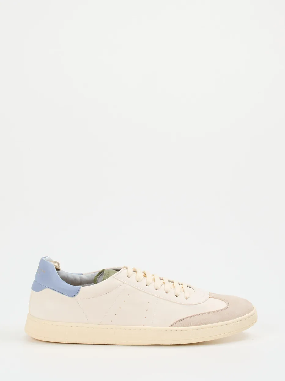 Minimalistische Raffinesse in hellen Tönen.Officine Creative präsentiert diesen Herren-Sneaker als edle Interpretation urbaner Lässigkeit. Ideal für Office-Outfits oder den entspannten Sonntagsbummel: Das cremeweiße Kalbleder zeigt sich besonders weich und kombiniert glatte Partien mit samtigem Veloursleder an Details. Die klassische, flache Silhouette wird durch eine pastellblaue Fersenkappe mit goldfarbenem Logoprint dezent akzentuiert. Seitliche Perforierungen sowie eine flexible Gummisohle runden das cleane Design funktional ab. Der Look fügt sich nahtlos in Trends wie „Quiet Luxury“ und „Soft Neutrals“. Ein vielseitiger Begleiter mit bequemen Eigenschaften und zurückhaltender Aussagekraft – stilistisch typisch Officine Creative.