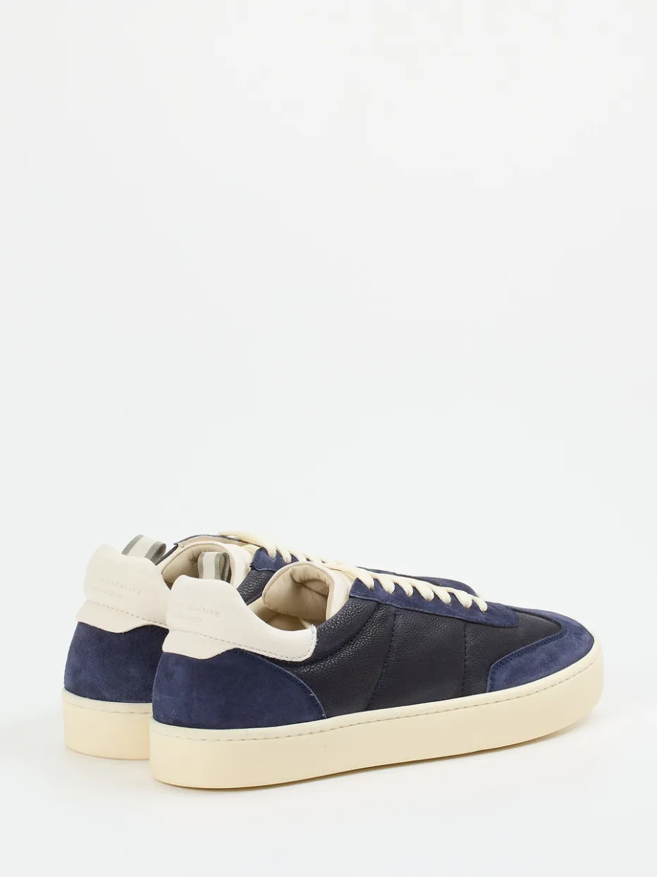 Stil trifft Komfort in urbaner Perfektion.Officine Creative präsentiert mit diesem Herren-Sneaker eine stilvolle Low-Top-Variante aus edlem Kalbleder. Für moderne Tage zwischen Büro und Freizeit bietet der dunkelblaue Ledermix aus glatter und samtig angeschliffener Oberfläche angenehmen Tragekomfort und visuelle Tiefe. Die flache Silhouette, cremeweiße Schnürsenkel und dezente Ton-in-Ton-Nähte unterstreichen den minimalistischen Charakter mit subtiler Retro-Note. Die flexible Gummisohle unterstützt ein natürliches Laufgefühl, das gepolsterte Fußbett ist herausnehmbar. Inspiriert von „Quiet Luxury“ und Streetwear-Codes – ideal für cleane, clevere Looks. Zeitlose Handwerkskunst mit hochwertigem Anspruch – made by Officine Creative.