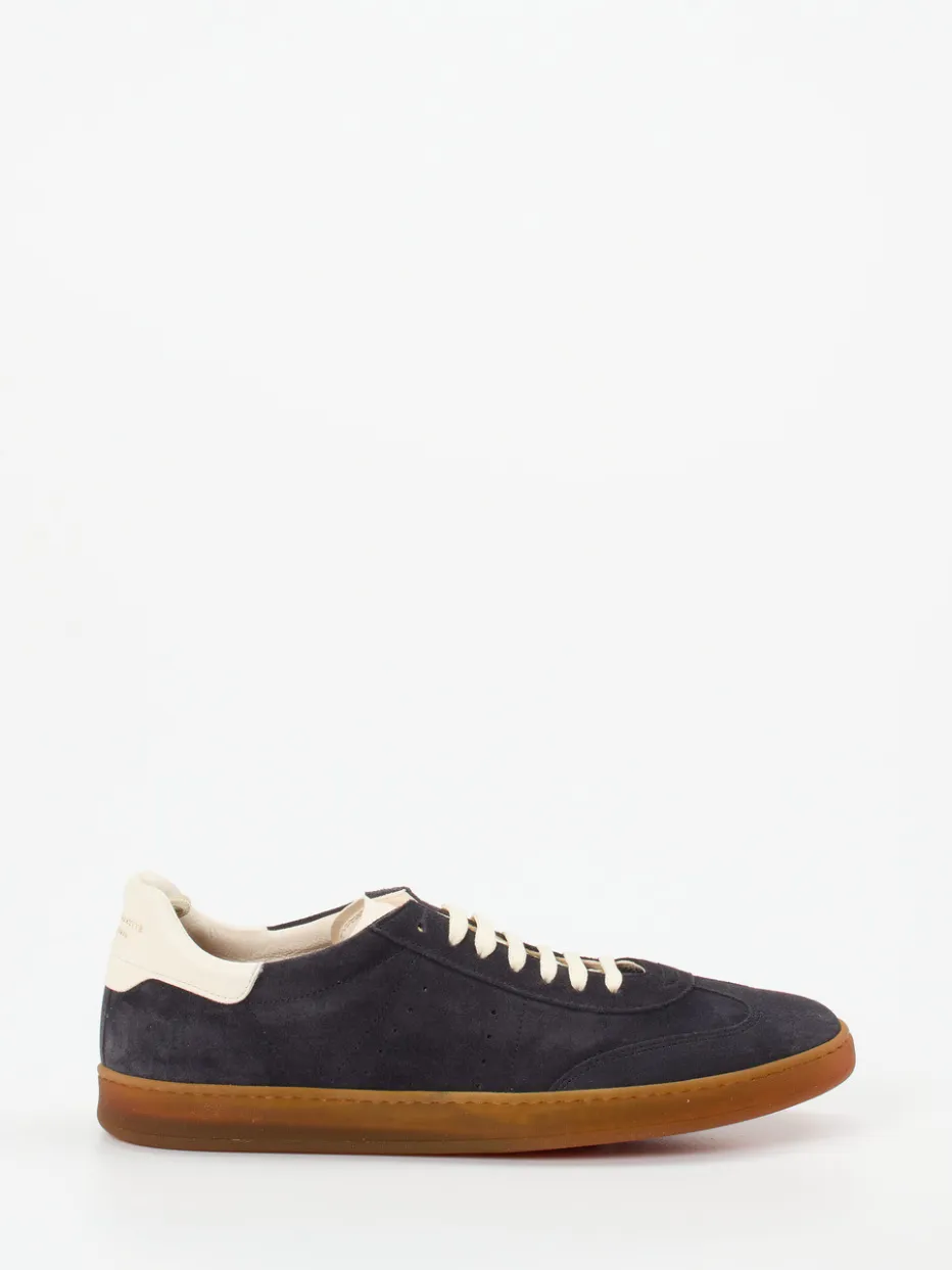 Weiches Veloursleder mit samtiger Oberfläche bildet das dunkelblaue Obermaterial, kontrastiert von cremefarbenen Details an Ferse, Zunge und Schnürung. Die bernsteinfarbene Gummisohle mit subtiler Transparenz sorgt für angenehme Flexibilität. Die klassische Silhouette unterstreicht den minimalistischen Streetwear-Charakter. Dank herausnehmbarem, lederbezogenem Fußbett auch für Einlagen geeignet. Besonders stimmig zu cremefarbenen Chinos oder cognacfarbenem Leder-Rucksack.