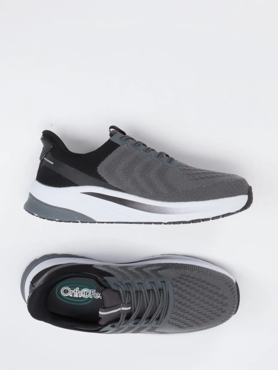 Entspannt durch Alltag und Freizeit. Orthofeet präsentiert mit diesem Herren-Sneaker einen sportlich inspirierten Allrounder. Das graue Modell überzeugt durch ein gestricktes Textil-Obermaterial mit atmungsaktiver Mesh-Struktur. Eine ergonomisch geformte Gummisohle sorgt für Komfort bei urbanen Aktivitäten und leichten Fitness-Einheiten. Details wie reflektierende Elemente an Ferse und Zunge, ein gepolsterter Einstieg sowie die schnörkellose Schnürung unterstreichen das funktionale Design. Die klare Linienführung und monochrome Farbgebung passen zu minimalistischen Looks mit sportlichem Anspruch. Ein stilvoller Komfortschuh mit Streetwear-Charakter und alltagstauglicher Leichtigkeit.
