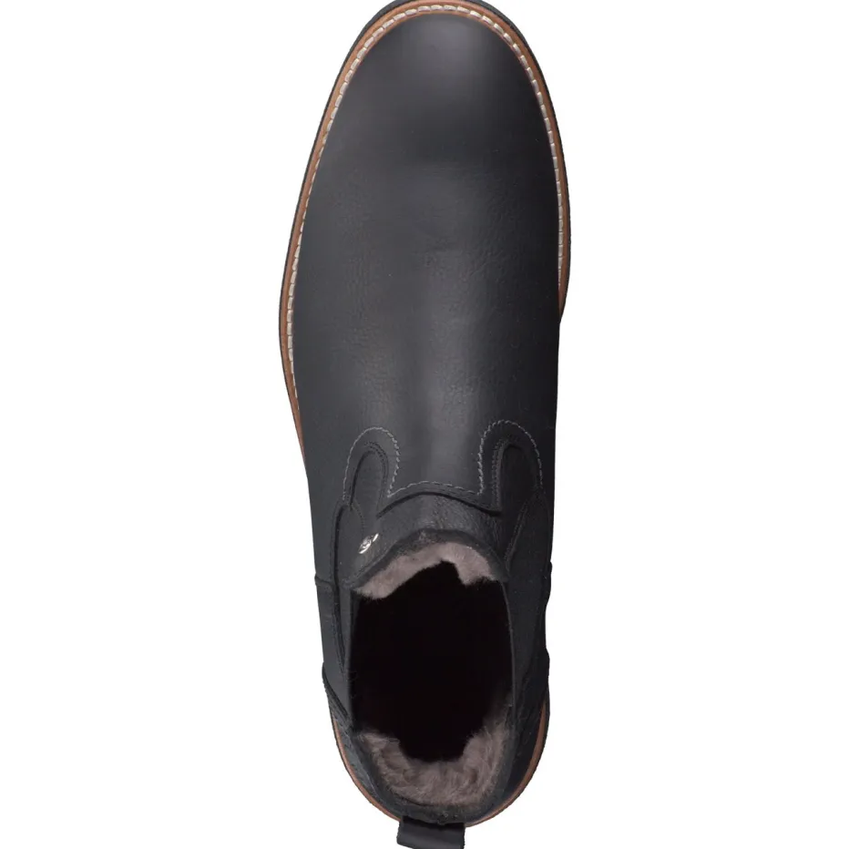 Stilvoll durch Herbst und Winter.Panama Jack präsentiert mit diesem Herren-Chelsea eine vielseitige Stiefelette für Alltag und Büro. Die Kombination aus schwarzem Fettleder mit matter Oberfläche und wärmendem Lammfell-Futter bietet zuverlässige Funktionalität bei kühleren Temperaturen. Charakteristische Elastikeinsätze und eine praktische Zuglasche erleichtern den Einstieg. Die knöchelhohe Silhouette und die profilierte Gummisohle garantieren in Verbindung mit der rutschhemmenden Struktur sicheren Tritt. Dezente Details wie das geprägte Markenlogo und eine Kontrastnaht an der Sohle komplettieren den Look im Sinne des „Quiet Luxury“-Trends. Passt ideal zu dunklen Jeans und Wollmänteln. Nachhaltige Wertigkeit und Komfort im typischen Panama Jack-Stil.