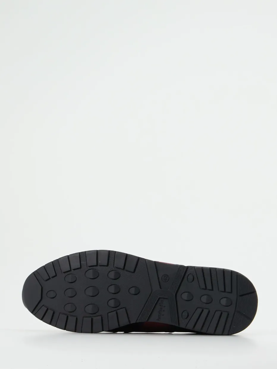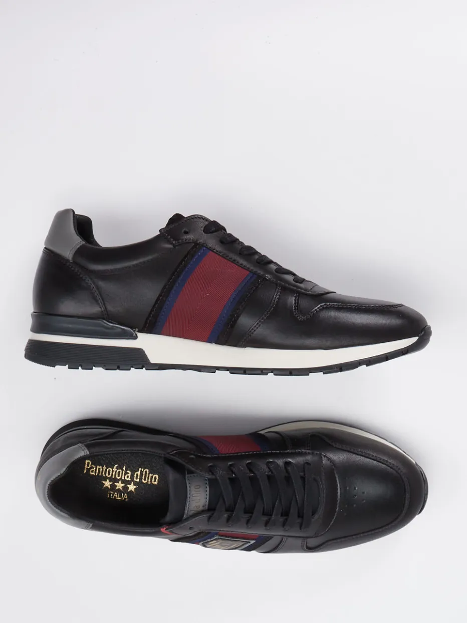 Retro-Statement fürs urbane Styling.Der Herren-Sneaker von Pantofola d’Oro vereint sportliche Retro-Vibes mit italienischer Designkompetenz. Für stilvolle Alltagslooks bietet das Modell aus edlem, mattem Kalbleder einen angenehmen Tragekomfort. Schwarze Grundflächen kontrastieren effektvoll mit bordeauxroten und dunkelblauen Akzenten sowie goldfarbenen Logoelementen. Kontraststreifen an den Seiten, gepolstertes Innenfutter aus Leder und eine griffige Gummisohle runden die klassische Runner-Silhouette ab. Ideal kombinierbar mit Chinohose und weißem Hemd für einen lässig-eleganten Auftritt. Pantofola d’Oro steht für sportlich-elegante Lässigkeit mit markentypischer Verarbeitungsqualität.
