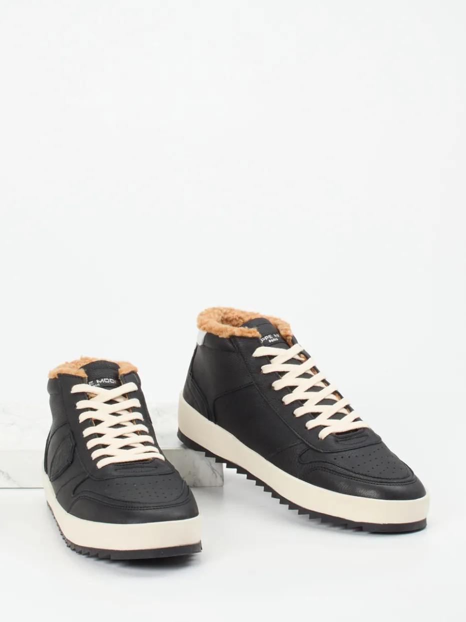 Urbaner Begleiter mit Komfortfaktor.Philippe Model interpretiert den klassischen High-Top Sneaker mit schwarzem Kalbleder und luxuriösem Innenfutter neu. Ideal für winterliche City-Streifzüge: Das genarbte Kalbleder sorgt für eine edle Anmutung, während das beige Textilfutter in Kunstfell-Optik warme Füße garantiert. Die kontrastierenden Schnürsenkel und das weiße Markenlogo an der Ferse setzen markante Akzente. Für sicheres Gehen sorgt die rutschfeste Gummisohle mit Haifischzahnprofil. Dieser Sneaker vereint Streetwear-Einflüsse mit funktionaler Wärme – und passt hervorragend zu Steppjacke und Denim. Markentypisch kombiniert Philippe Model Stilbewusstsein mit hochwertiger Verarbeitung.