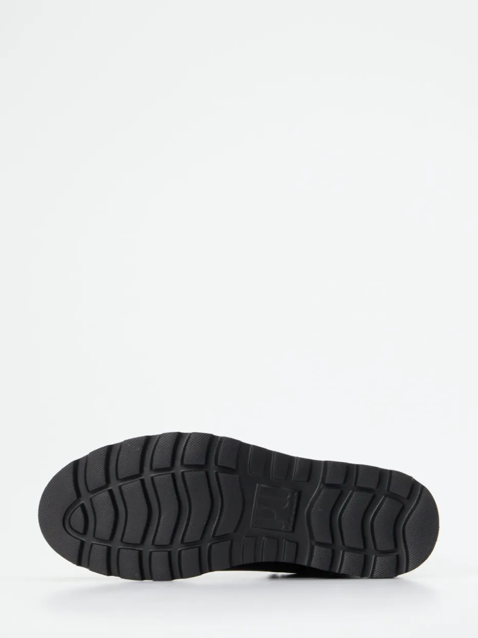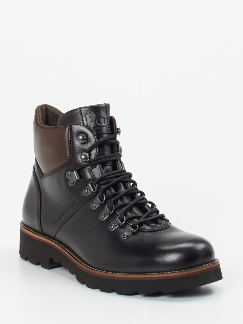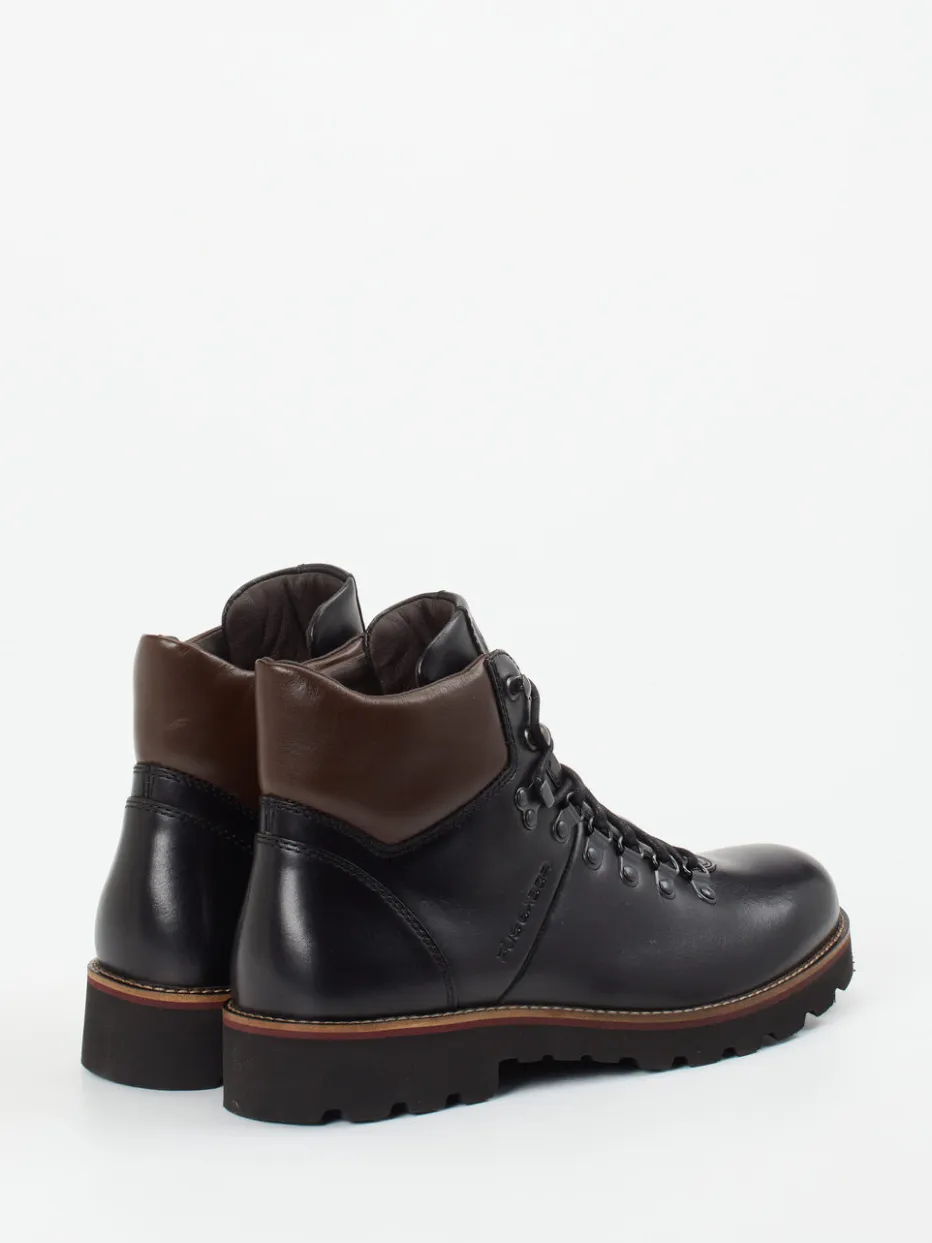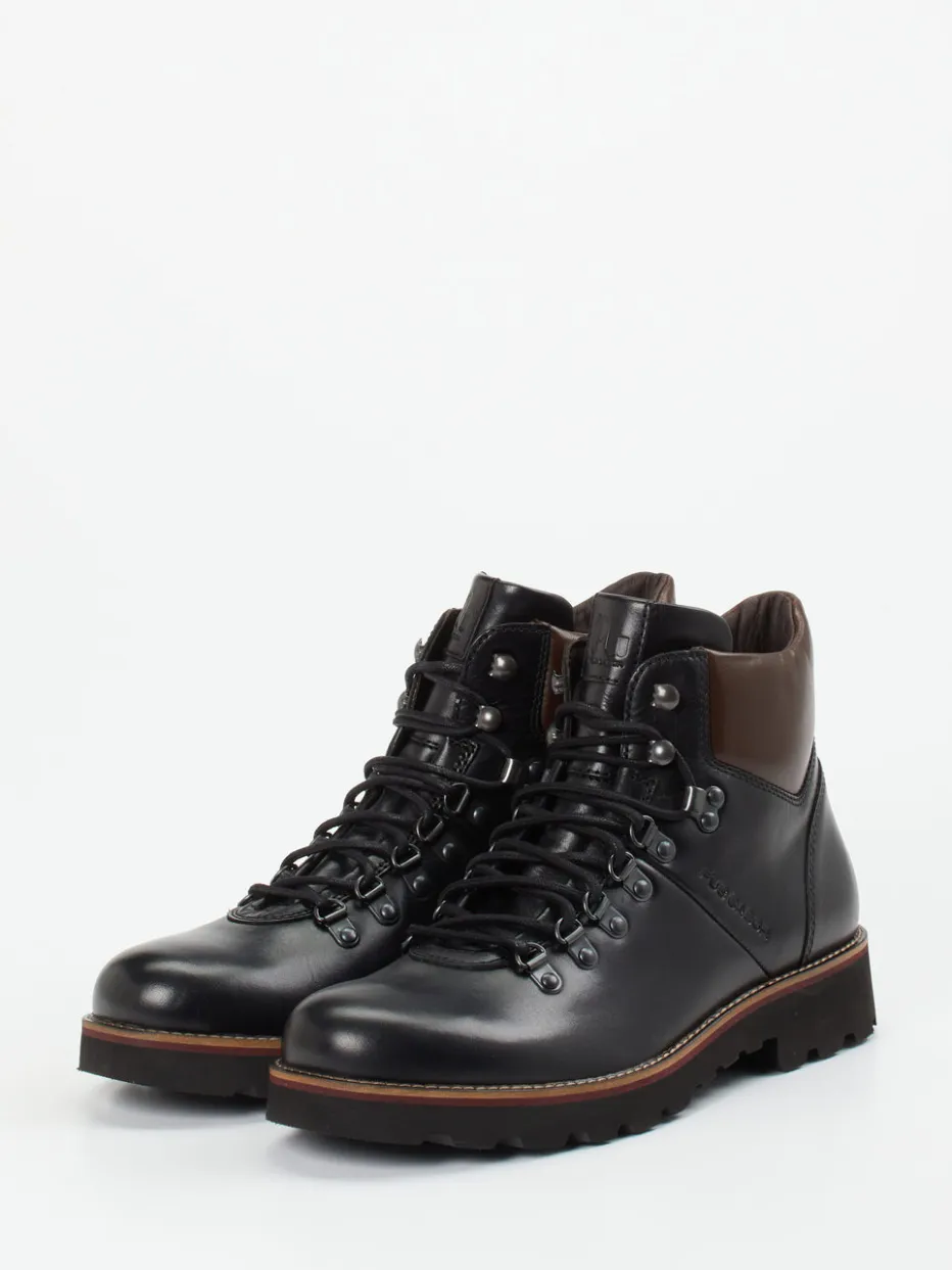 Ob auf herbstlichen Spazierwegen oder im städtischen Kontext – diese knöchelhohen Boots bieten modernen Komfort und funktionalen Stil. Das glänzende Kalbleder wirkt hochwertig und langlebig, während die schwarz-dunkelbraune Farbkombination eine dezente Kontrastwirkung erzeugt. Die robuste Schnürung mit Metallhaken sowie die stark profilierte Gummisohle erhöhen die Trittsicherheit auf wechselnden Untergründen. Der weich gepolsterte Schaftabschluss aus Textil sorgt für angenehmen Halt. Der Look verankert sich stilsicher zwischen Workwear und modischem „Quiet Luxury“.