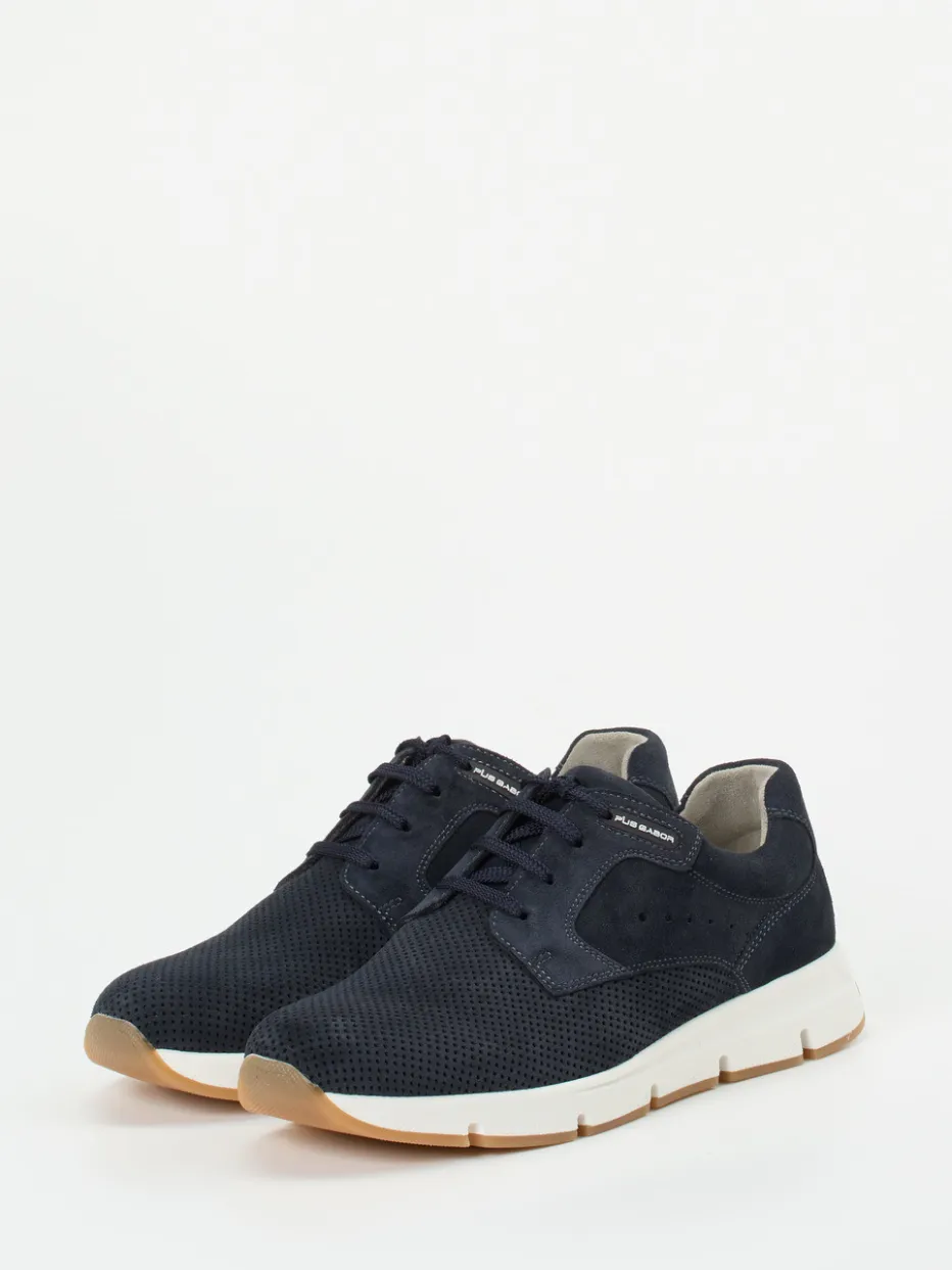 Sportlich klar. Stilvoll komfortabel.Der Damen-Sneaker von Pius Gabor bietet minimalistisches Design mit sportivem Charakter. Für entspannte Arbeitstage oder lässige Stadtausflüge kombiniert dieses Modell hochwertiges Veloursleder mit einer samtig angerauten Oberfläche und atmungsaktivem Lochmuster. Das dunkelblaue Leder trifft auf ein tonales Erscheinungsbild mit dezenten Ziernähten und seitlichem Markenlogo. Eine leicht profilierte Gummisohle mit moderner Wellenstruktur sowie ein gepolsterter Schaftrand ergänzen die alltagstaugliche Silhouette. Die klare Linienführung passt zum Trend „Quiet Luxury“. Komfort und Qualität im urbanen Look – markentypisch Pius Gabor.