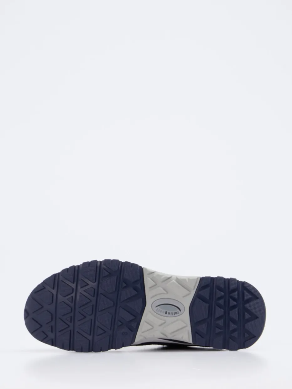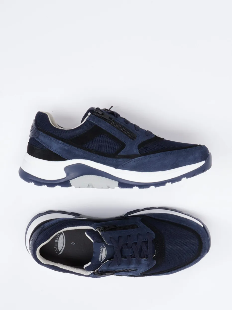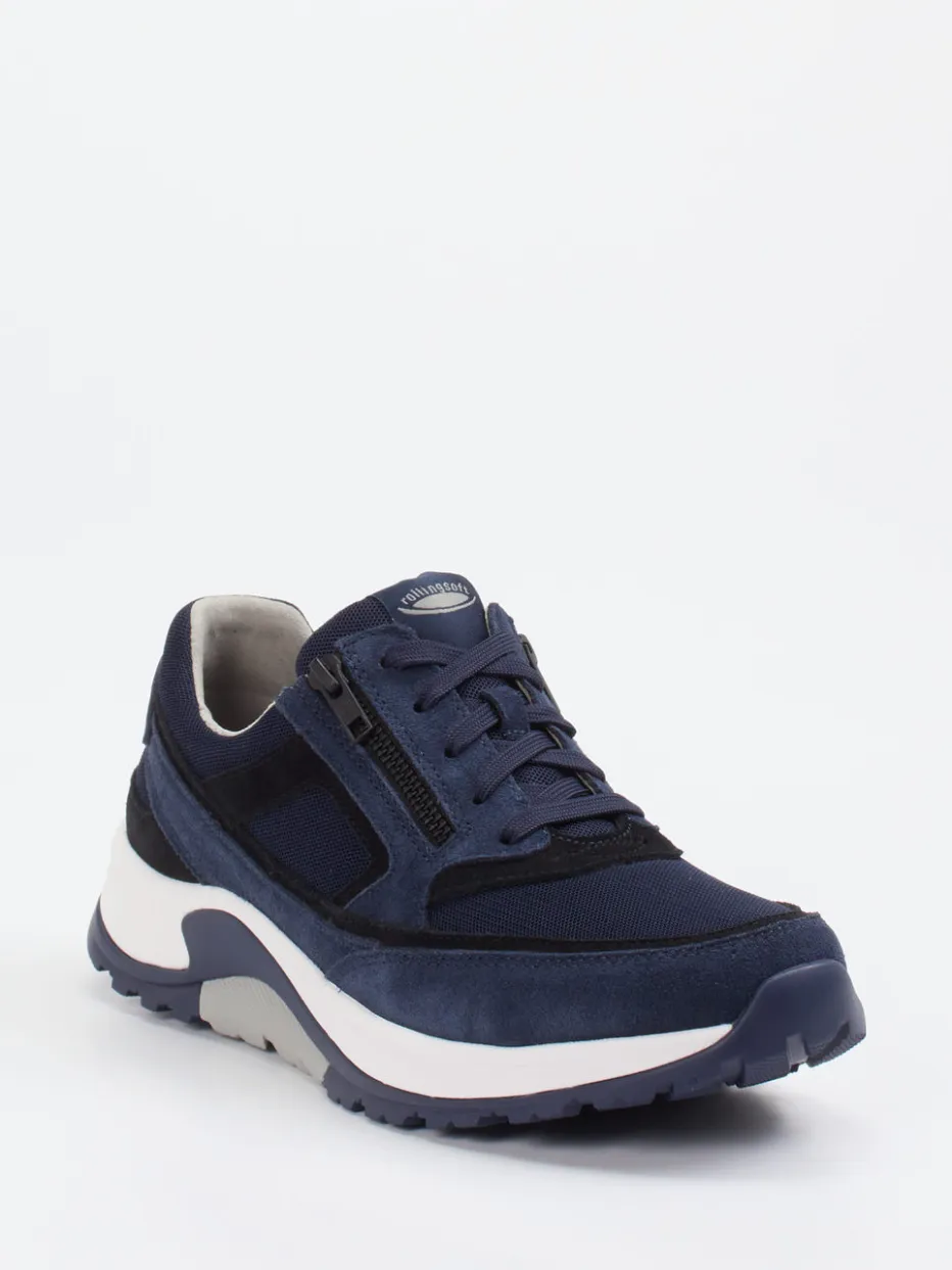 Frische Dynamik für bewegte Tage.Pius Gabor präsentiert einen alltagstauglichen Sneaker in sportlich-bulky Silhouette. Für ausgedehnte Wege in der Stadt oder auf Reisen bietet dieser Sneaker angenehme Leichtigkeit dank atmungsaktivem Mesh und samtig angeschliffenem Veloursleder in Marineblau. Die kontrastierende Gummisohle mit gutem Grip und Dämpfung sorgt für Stabilität. Highlights wie der seitliche Reißverschluss und gepolsterte Schaftrand erhöhen den Tragekomfort zusätzlich. Schwarz abgesetzte Overlays bringen moderne Streetwear-Ästhetik ins Spiel. Perfekt kombiniert mit legeren Urban Looks. Komfortables Tragegefühl im markentypischen Athleisure-Stil von Pius Gabor.