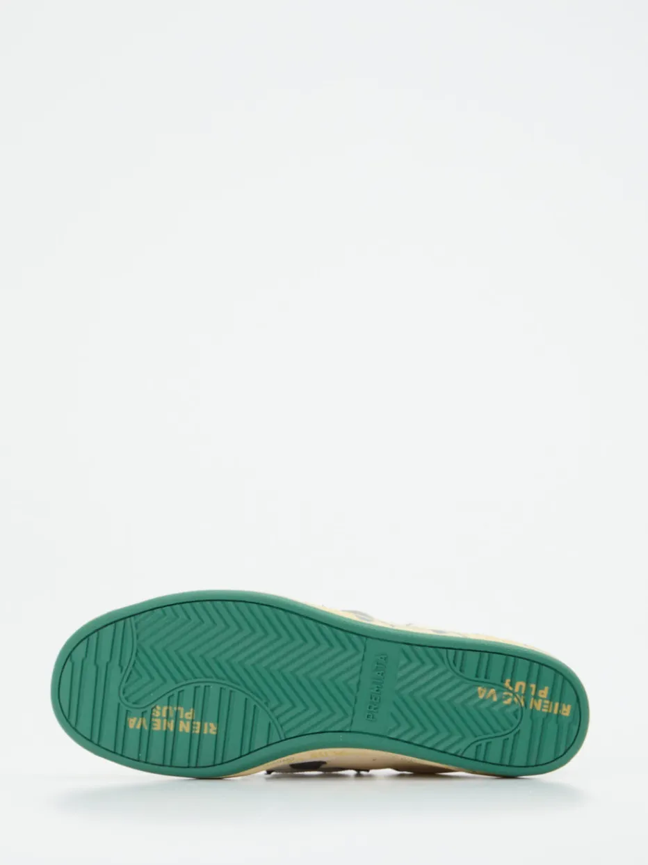 Retro-Vibes neu gedacht.Premiata bringt mit diesem Low-Top-Sneaker ein vielseitiges Statement-Piece in die Streetwear-Kollektion. Ideal für urbane Freizeitmomente kombiniert das Modell texturiertes Kalbleder – glatt und weich angeschliffen – in Creme- und Beigetönen mit dunkelgrünen Kontrastelementen. Die klassisch flache Silhouette mit perforierter Zehenbox und Schnürung trifft auf eine typografisch bedruckte, griffig profilierte Sohle. Innen sorgt Kalblederfutter für Komfort, ein gepolstertes Wechselfußbett bietet Alltagstauglichkeit. Inspiriert von Retro-Basketball-Designs passt der Sneaker ideal zum Y2K-Trend und lässt sich mit weißen Socken oder grüner Cap stylen. Premiata steht für hochwertige Materialien und progressive Detailgestaltung mit urbanem Anspruch.