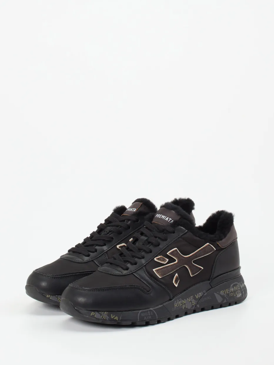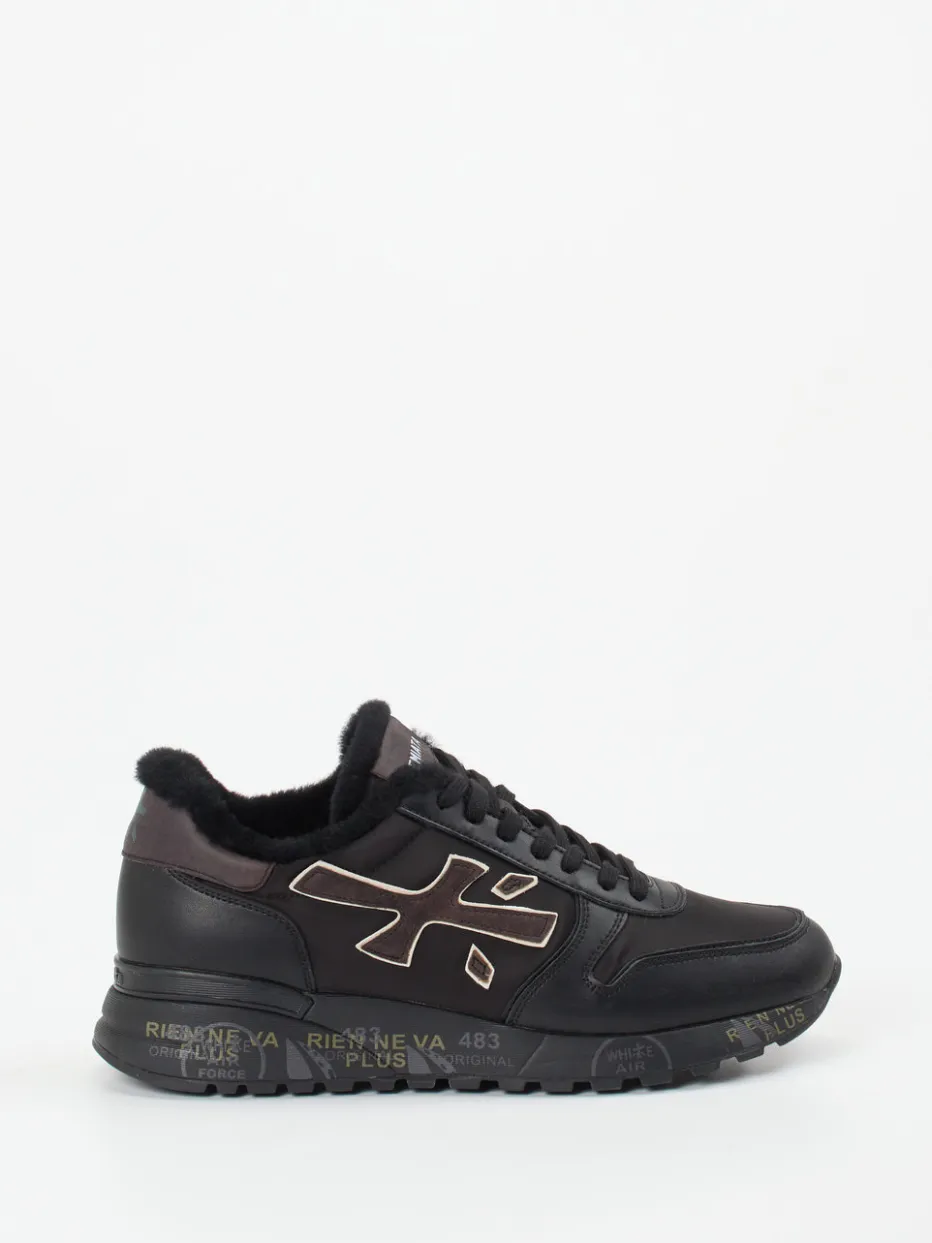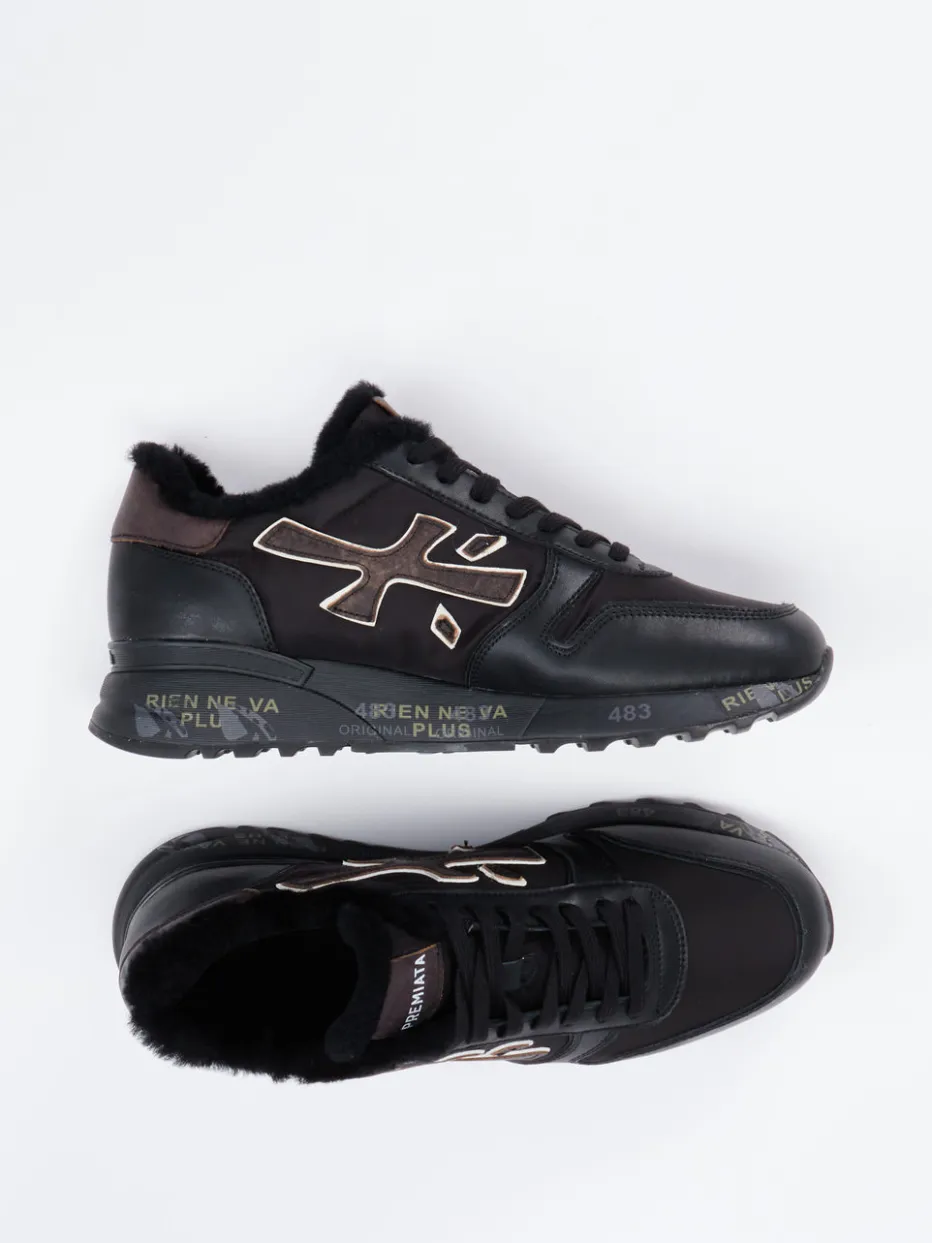Urbaner Stil trifft Winterkomfort.Premiata präsentiert mit diesem Sneaker ein stilvolles Herrenmodell, das durch hochwertige Materialien und durchdachtes Design überzeugt. Für entspannte City-Trips oder warme Füße in der Freizeit: Der Sneaker aus schwarzem Kalbleder wird durch eine samtige Nylon-Oberfläche und weiches Lammfellfutter ergänzt. Matt wirkende Texturen und goldfarbene Logo-Applikationen prägen den Look, während eine bunt bedruckte Gummisohle mit Profil sicheren Halt gibt. Die klassische Silhouette mit gepolstertem Einstieg sorgt für lässigen Tragekomfort. Der Stil orientiert sich an Streetwear mit „Quiet Luxury“-Akzenten – ideal für den Wintertrend. Premiata vereint lässigen Luxus mit funktionaler Raffinesse auf hohem Niveau.