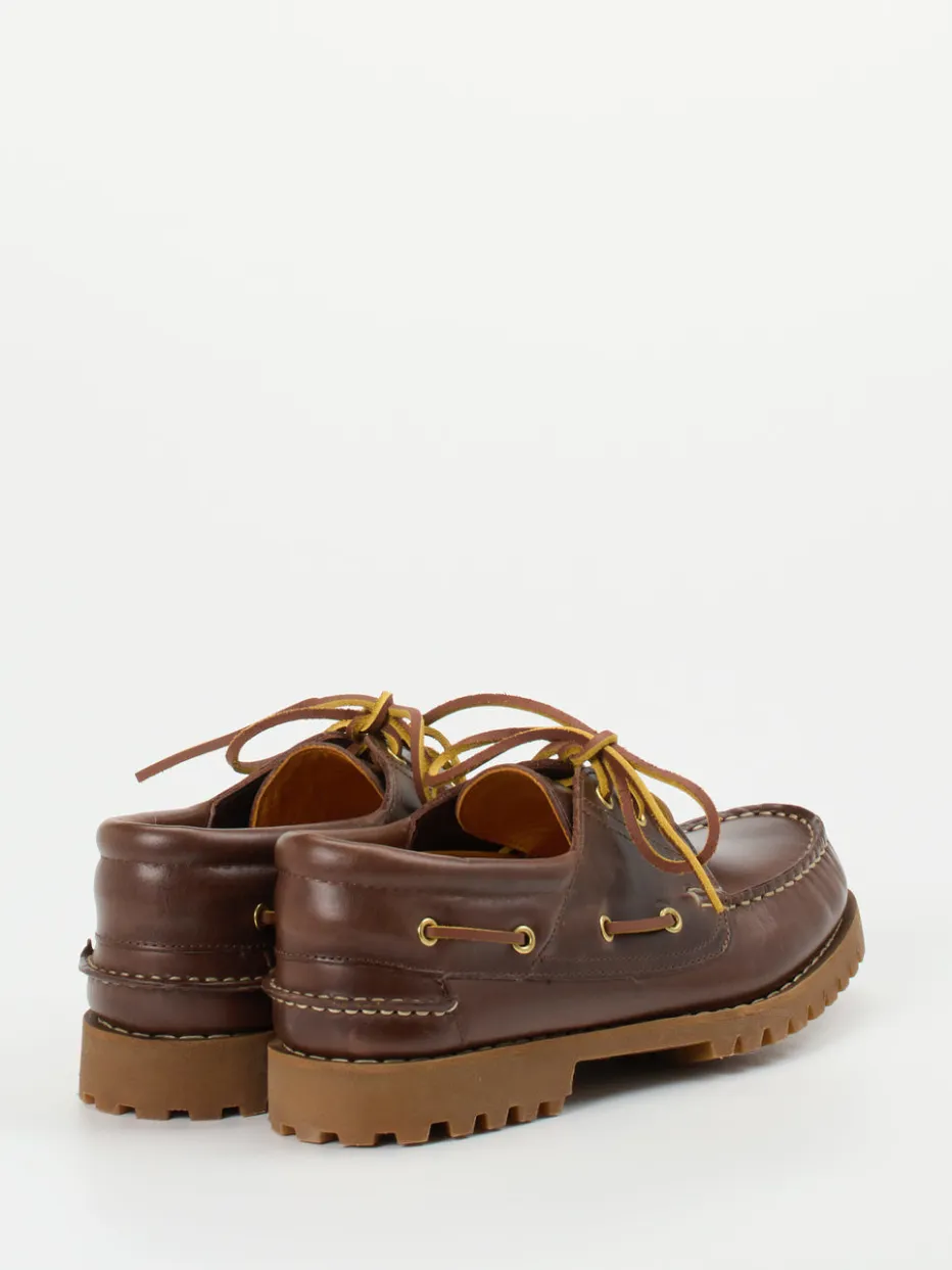 Für Spaziergänge am Wasser oder urbane Alltagswege bietet das Modell zuverlässigen Halt und langlebige Qualität. Das dunkelbraune, glänzende Fettleder ist wasserabweisend und unterstreicht den klassischen Look mit typischer Mokassinnaht und goldfarbenen Ösen. Details wie das umlaufende Lederband und das weiche Kalblederfutter sorgen für hohen Tragekomfort. Die kräftige Gummisohle mit markantem Workerprofil gibt sicheren Grip auf wechselndem Untergrund. Ideal zu Chinohose und Strick – ein Klassiker mit Heritage-Charakter.
