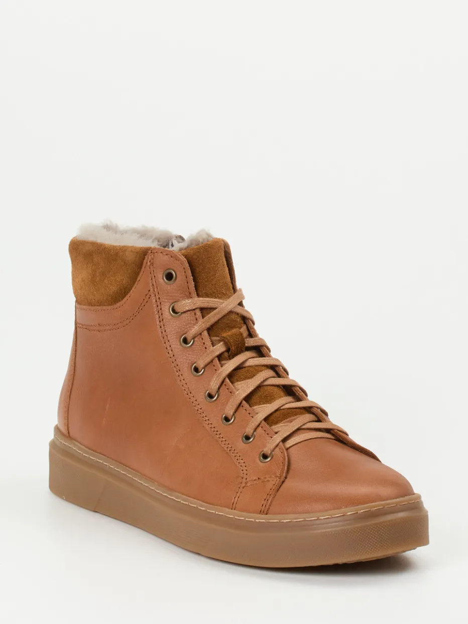 Warme Eleganz für kalte Tage.Ralph Harrison Country interpretiert den High-Top-Sneaker neu – mit robustem Fettleder und stilvollem Winterkomfort. Ideal für Freizeit und winterliche Citytouren bietet das cognacfarbene Modell mit beigegrauem Lammfellfutter zuverlässige Wärme. Der genarbte Materialmix aus geöltem Fettleder und Veloursleder sorgt für einen lässig-reduzierten Look, während die Kombination aus Reißverschluss und Schnürung einfaches Handling garantiert. Metallösen und ein Kontrastabschluss am Schaft akzentuieren das minimalistische Design. Die profilierte Gummisohle sichert Trittfestigkeit auch bei nassem Untergrund. Stilistisch bewegt sich der Sneaker zwischen Quiet Luxury und Streetwear. Ein hochwertiges Everyday-Essential im unaufgeregten Premium-Look.