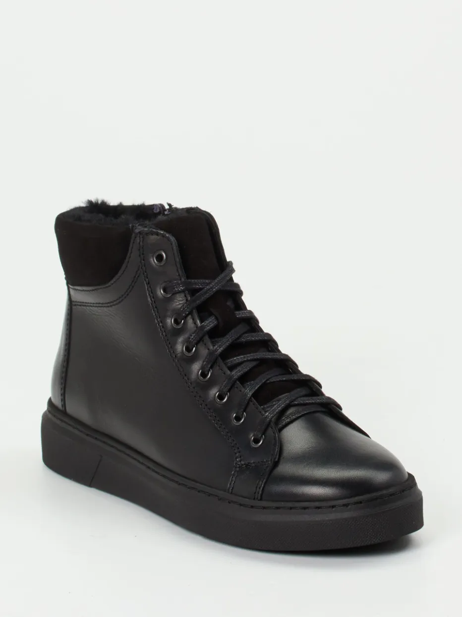 Cool durch kühle Tage.Ralph Harrison Country präsentiert einen High-Top Sneaker für den Herbst und Winter. Ideal für kalte Stadttage oder entspannte Freizeitoutfits: Das schwarze Modell aus strapazierfähigem Fettleder überzeugt mit samtig angeschliffenen Velourslederdetails. Eine Kombination aus Schnürung und seitlichem Reißverschluss verbindet praktischen Zugang mit modernem Look. Innen wärmt ein flauschiges Lammfellfutter. Die knöchelhohe Form zeigt klare Linienführung, das zurückhaltende Design unterstreicht den minimalistischen Streetwear-Stil. Die profilierte Gummisohle sorgt für Rutschfestigkeit. Ein komfortabler Begleiter mit markentypischem Anspruch an Qualität und Funktion.