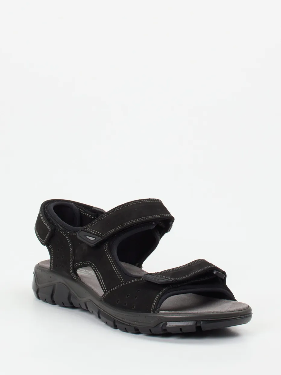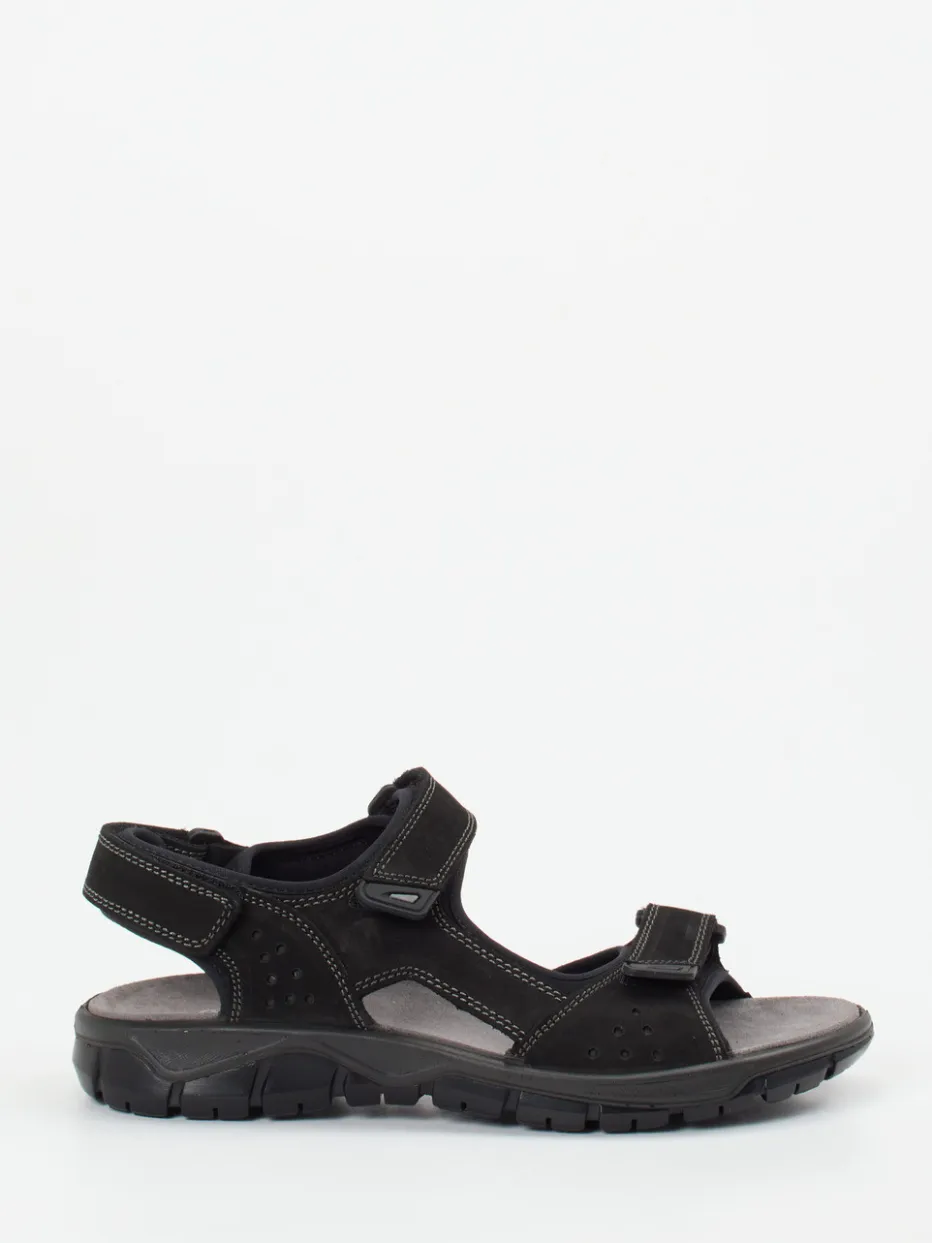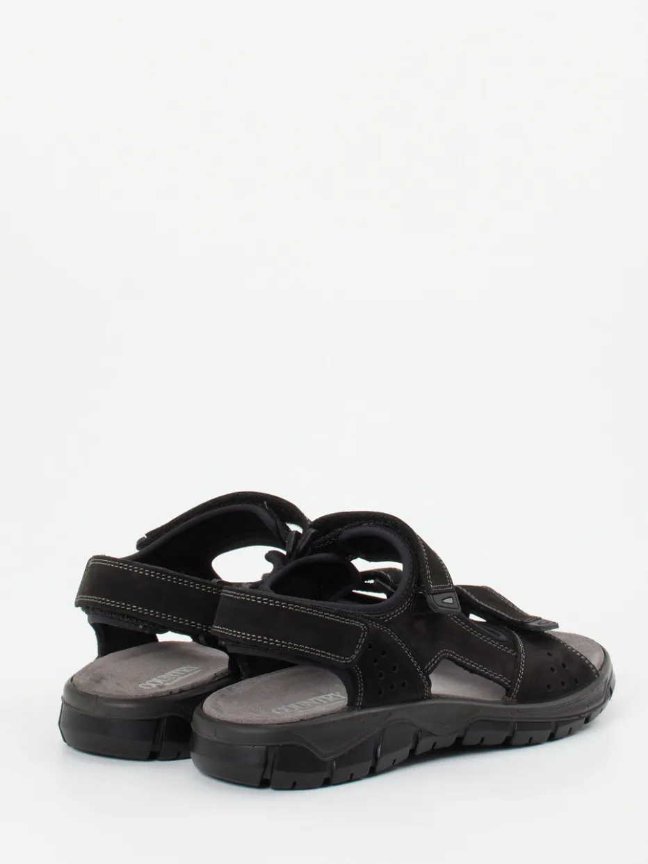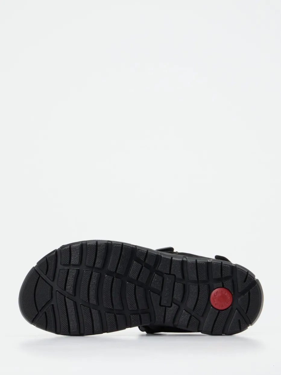 Komfortabler Halt für aktive Tage.Ralph Harrison Country präsentiert eine Herren-Trekkingsandale, die Funktionalität und Komfort vereint. Ideal für Wanderungen oder entspannte Freizeitstunden im Sommer überzeugt das Modell mit einem Obermaterial aus schwarzem Veloursleder – samtig angeschliffen und dank dreifacher Klettverschlüsse variabel anpassbar. Die matte Oberfläche wird durch hellgraue Kontrastnähte sportlich akzentuiert. Innen sorgen gepolsterte Nylonpartien sowie ein anatomisch geformtes Lederfußbett für langanhaltendes Tragevergnügen. Die strapazierfähige Gummisohle mit rutschfester Struktur und ShockAbsorber-Technologie unterstützt auf wechselndem Terrain. Inspiriert vom Gorpcore-Trend funktioniert diese Outdoorsandale zu Funktionsshorts ebenso wie zu urbanen Relax-Outfits. Ein verlässlicher Begleiter für Komfortliebhaber mit Sinn für sportiven Stil.