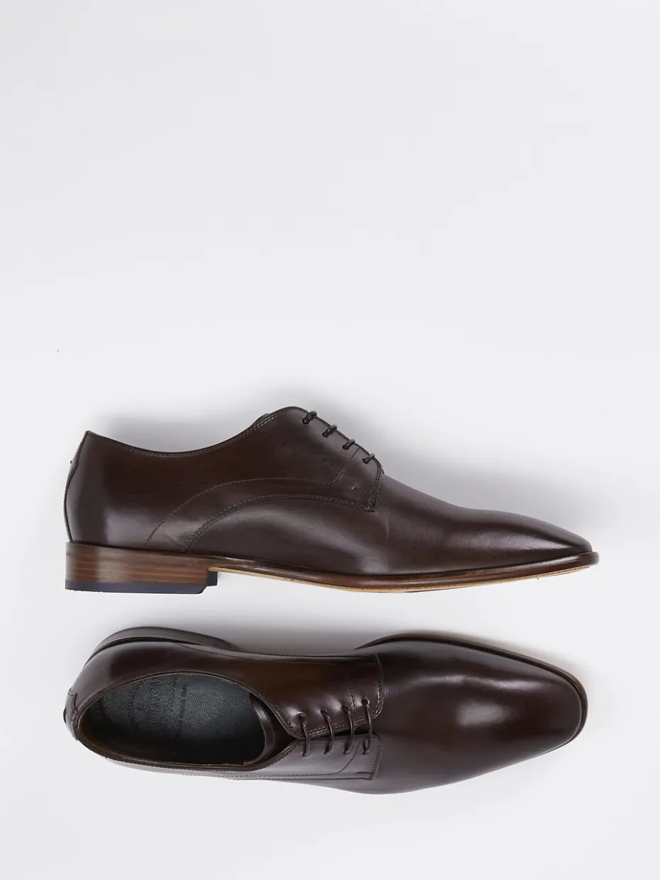 Formvollendet für Business und Anlass.Ralph Harrison Edition präsentiert einen Derby-Schnürschuh für Herren mit zeitloser Eleganz. Perfekt für formelle Outfits im Büro oder bei festlichen Events: Das tiefbraune Kalbleder zeigt sich glatt und leicht glänzend. Der schmal zulaufende Schnitt, die dezente 5-Loch-Schnürung und die fein strukturierten Nähte unterstreichen den klaren Stil. Die Ledersohle mit integrierten blauen Gummielementen sorgt für alltagstaugliche Bodenhaftung. Als modisches Statement fügt sich dieses Modell in die Trendlinien von Quiet Luxury und Modern Classic FW24. Stil & Komfort mit dezentem Understatement – Qualität von Ralph Harrison Edition.